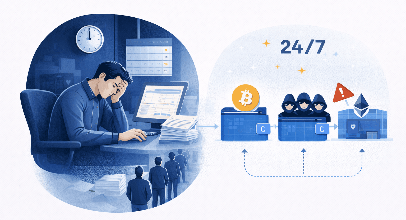 The biggest operational failure comes from trying to force human work schedules onto 24/7 blockchain activity. While banks and audit firms shut down at 5 PM, blockchains process billions of dollars all day and night. When a company relies on manual reviews, alerts pile up while the team sleeps. This forces a bad choice the next morning: either delay customer withdrawals for days to clear the backlog, or rush through the work and make mistakes. Humans simply cannot process this much high-speed data around the clock without burning out or missing details.