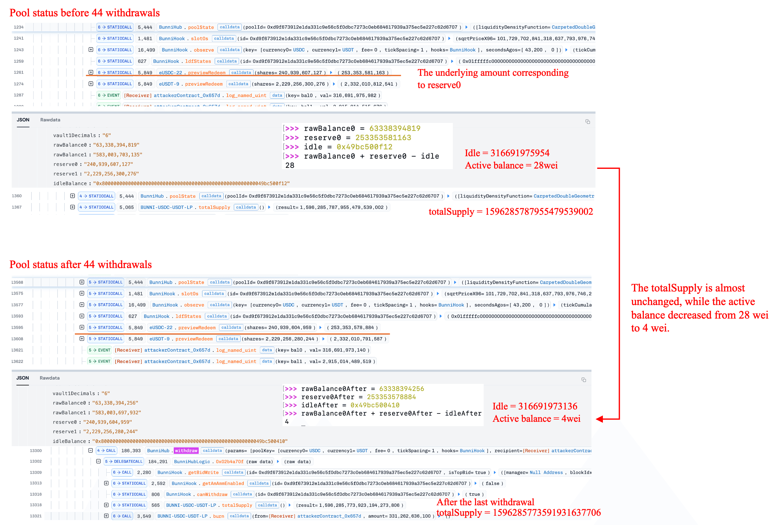- In the second stage, the core exploit was performed via a series of small withdrawals, causing the protocol to underestimate the pool's actual liquidity.