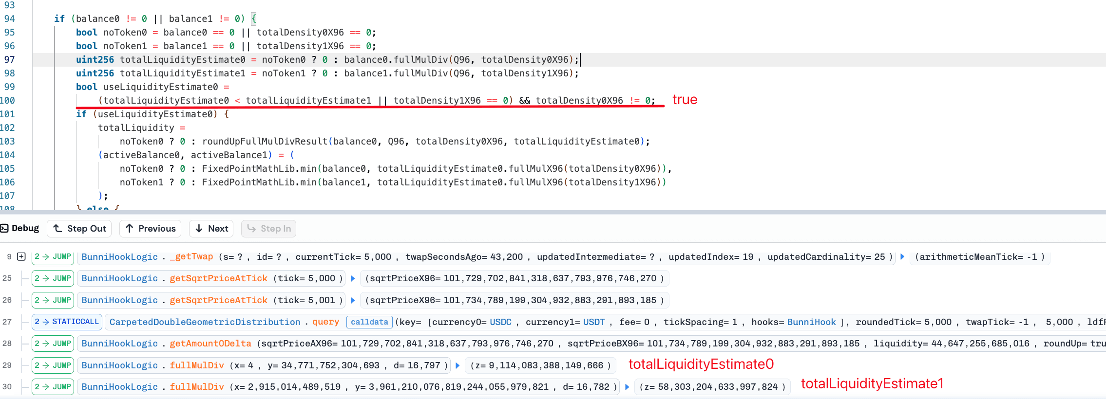 Step2: After the extreme price was formed, the attacker immediately reversed the operation, swapping a portion of the USDC back for USDT. Since the pool's price was now severely misaligned, the return value of the queryLDF() function for USDC liquidity density dropped to 1. That made the liquidity value estimated based on USDC greater than the estimated value based on USDT.