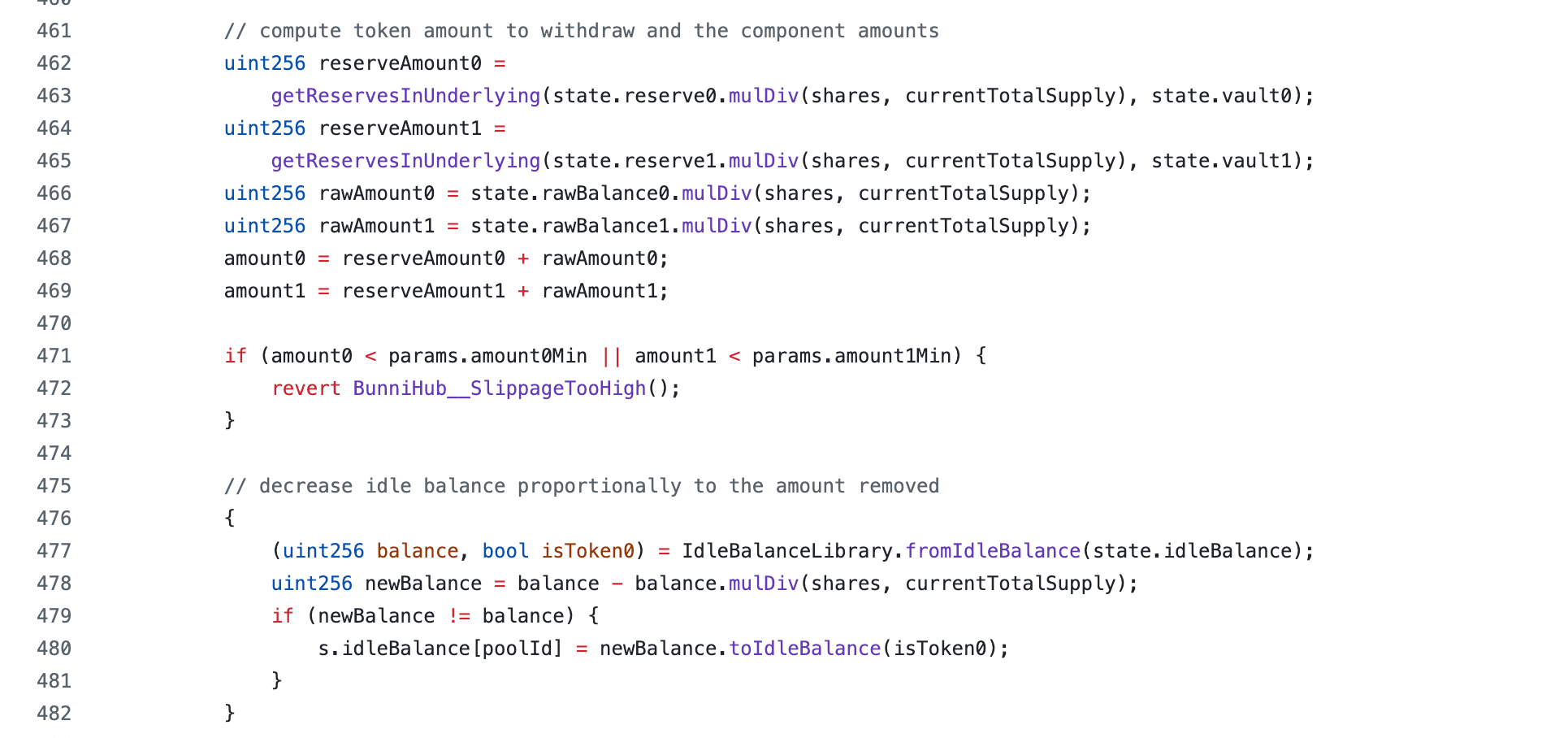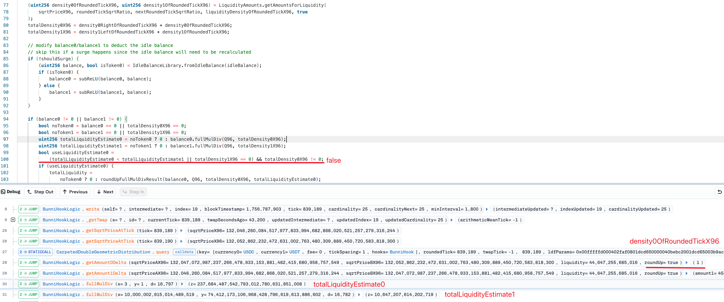 Recalling the available balance formula**,**. An overestimated idle balance directly causes the available balance (balance0) used for liquidity calculations to be underestimated. Consequently, the estimated effective total liquidity is also undervalued. According to the Bunni Exploit Post Mortem [7], this rounding direction in liquidity calculations was intentionally employed. A lower calculated liquidity value leads to a higher price impact during swaps.
