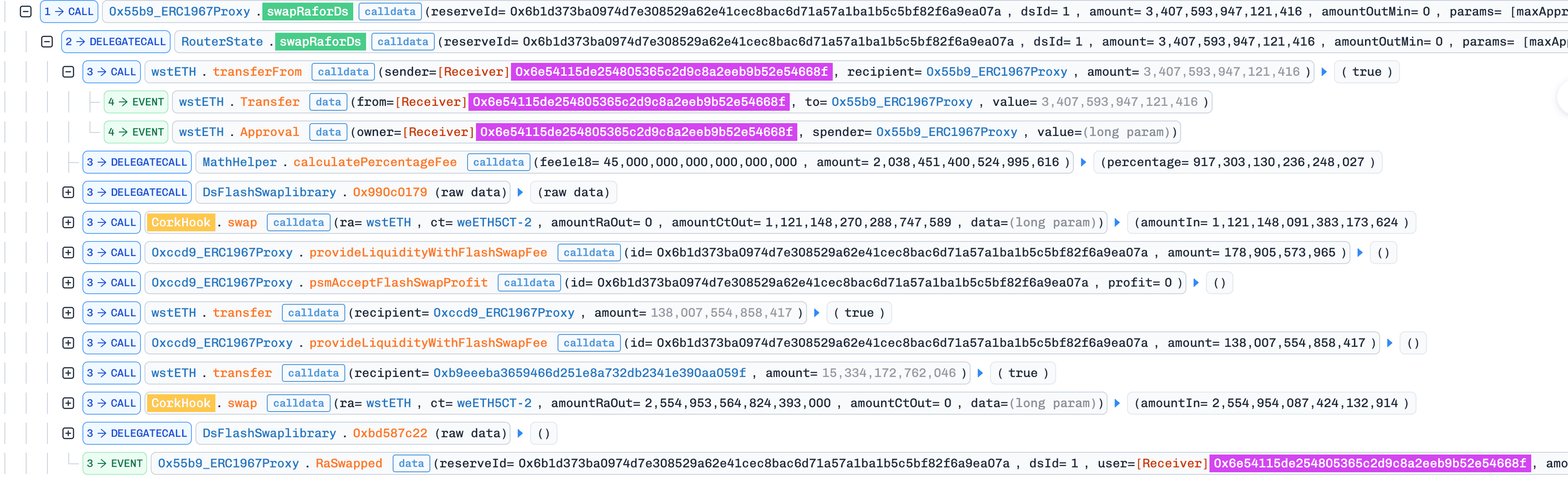 In this transaction, the attacker called SwapRaForDs() shortly before market expiration. Because was near zero, this swap generated a disproportionately large risk premium (Section 0x1.3), inflating accumulatedHIYA.