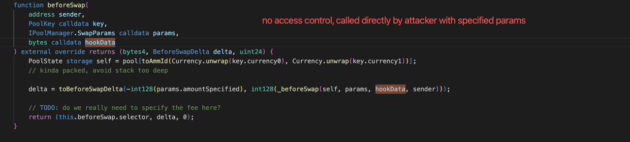 FlashSwap [FlashSwapRouter.swapDsforRa]: This mechanism is central to the exploit. The attacker later triggers this path through a direct, unauthenticated call to beforeSwap (Section 0x2.2).