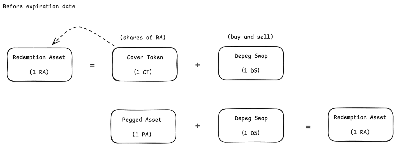 The Cork Pool receives deposits of Redemption Asset, which is locked. In return, two tokens are minted and returned to the depositor: Depeg Swap (DS) and Cover Token (CT). Before the set expiration date, 1 DS + 1 CT/PA can be swapped back for 1 RA; after expiration, 1 CT can be redeemed proportionally for the remaining RA + PA in the pool.