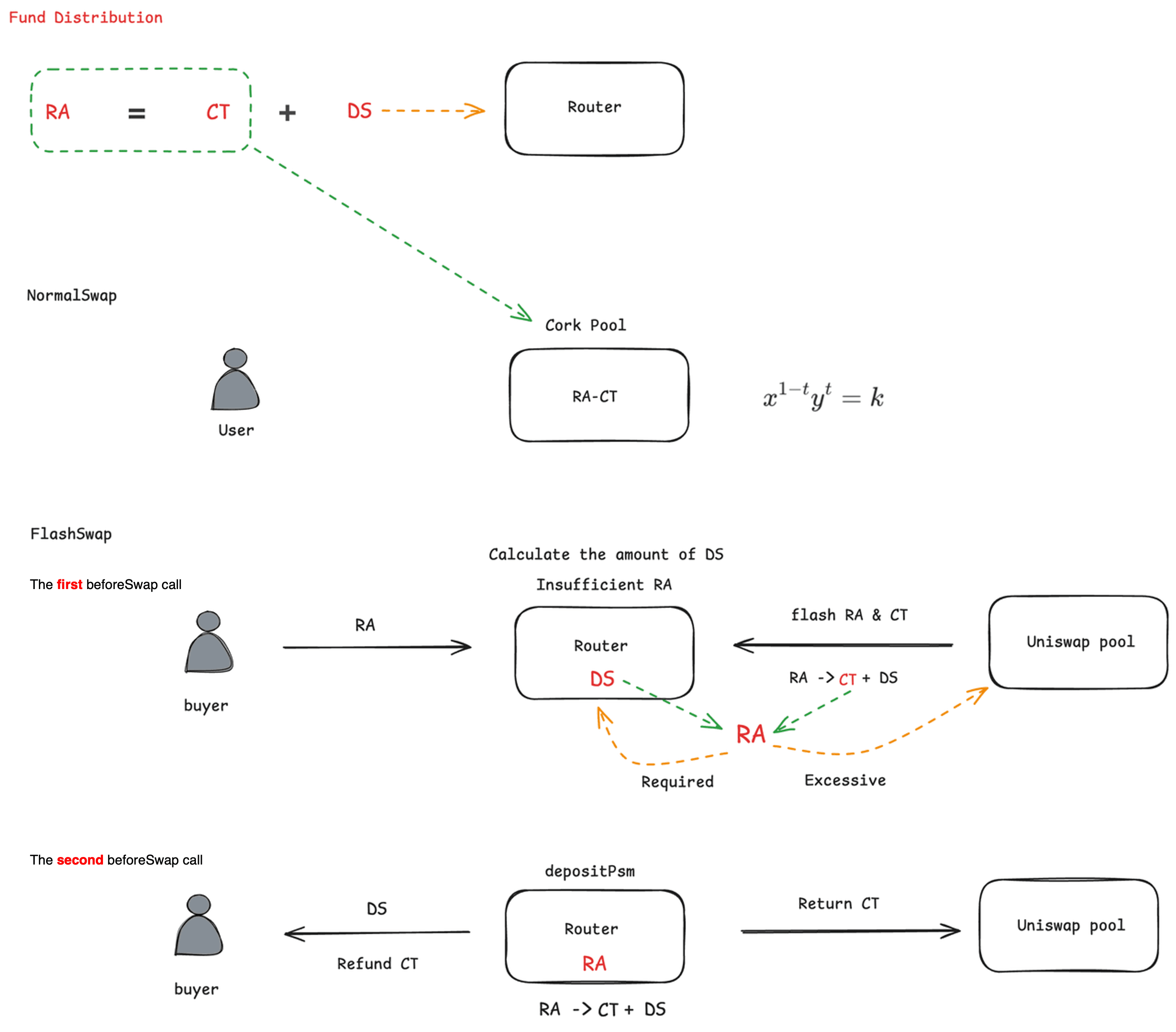 Both DS and CT are tradeable. Users can trade CT and RA using NormalSwap based on a custom AMM curve through CorkHook, while DS and RA are traded using FlashSwap via Router and CorkHook.