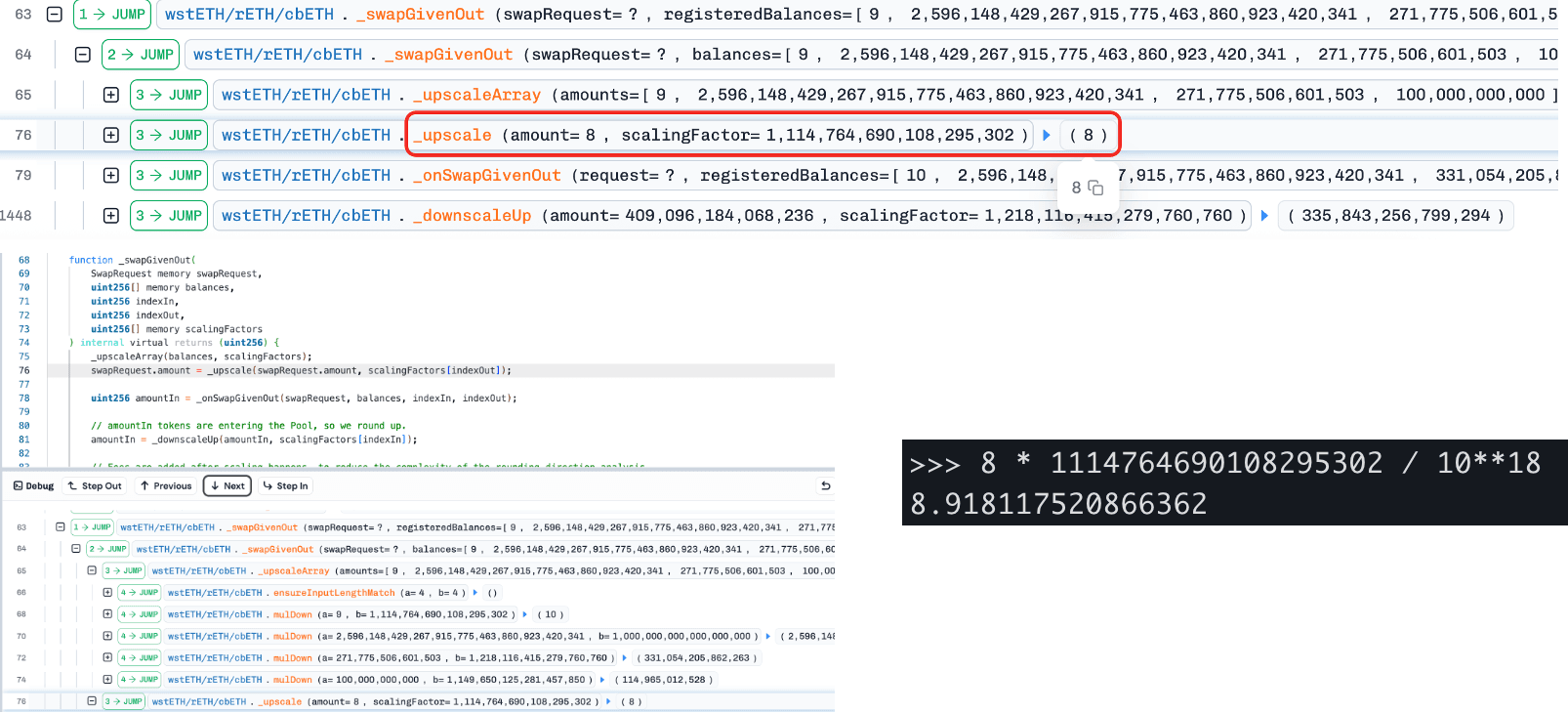 Step 2: The attacker then swaps between another underlying (wstETH) and cbETH using a crafted amount (= 8). Due to rounding down when scaling token amounts, the computed Δx becomes slightly smaller (8.918 to 8), leading to an underestimated Δy and thus a smaller invariant (D from Curve’s StableSwap model). Since BPT price = D / totalSupply, the BPT price becomes artificially deflated.