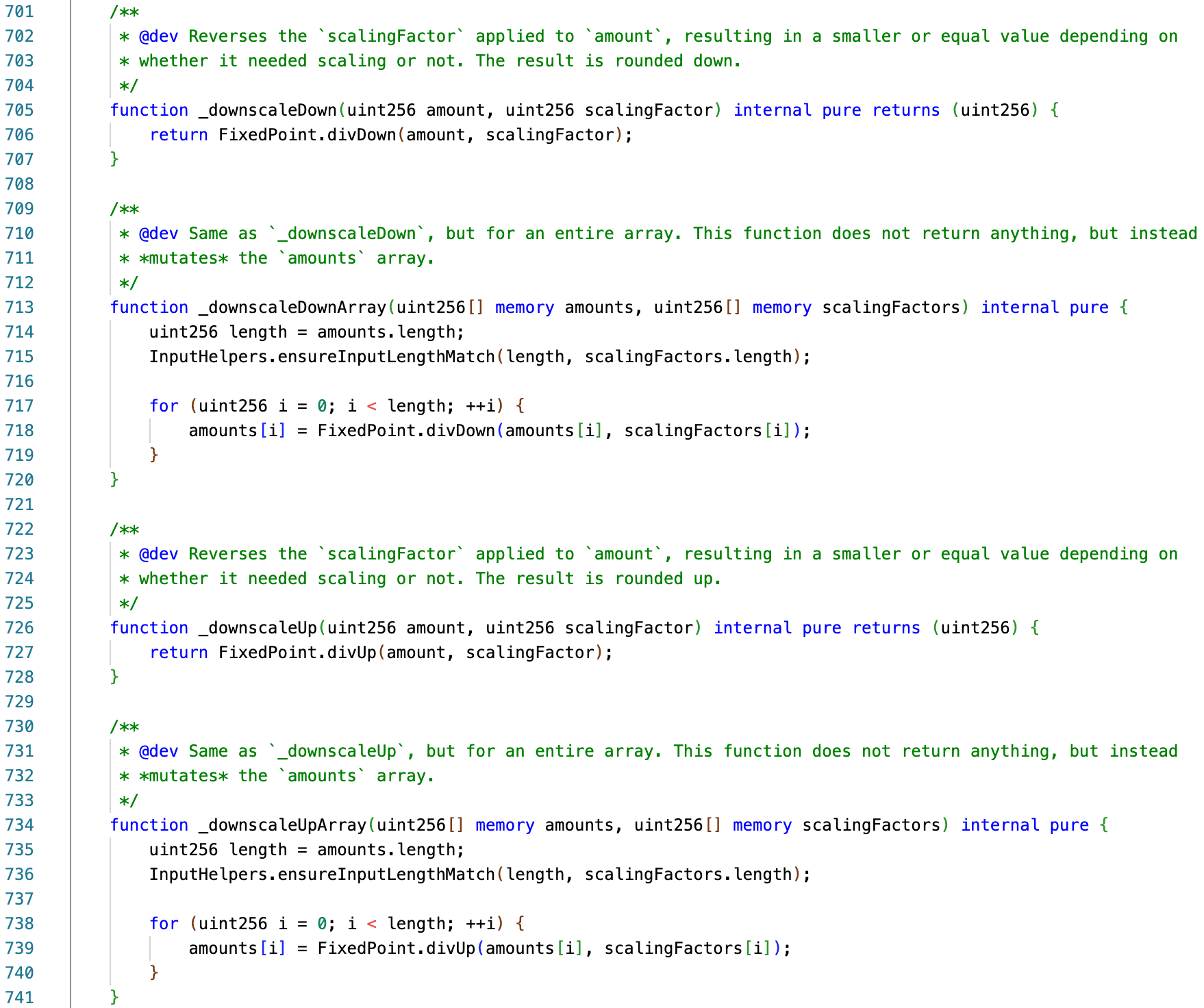 - Downscaling: Convert the results back to their native precision, applying directional rounding (for example, input amounts are usually rounded up to ensure the pool does not undercharge, while output amounts are often rounded down).