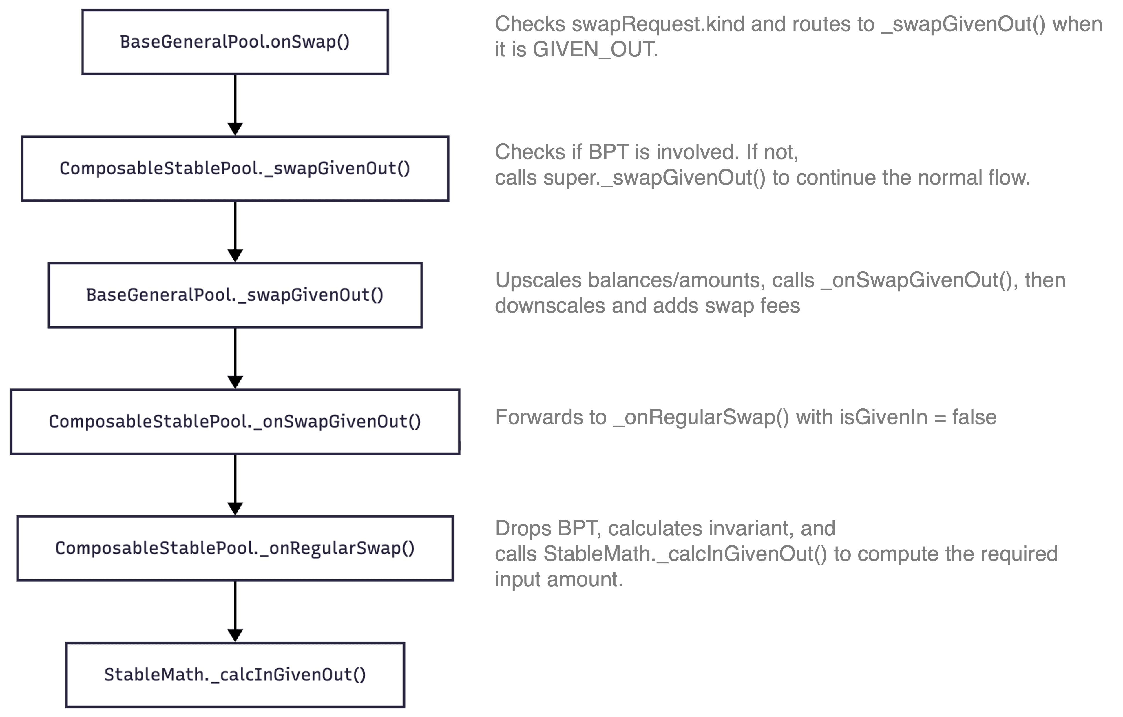 Typically, a batchSwap() consists of multiple token-to-token swaps executed via the onSwap() function. The following outlines the execution path when a SwapRequest is assigned a GIVEN_OUT swap type (note that ComposableStablePool inherits from BaseGeneralPool):