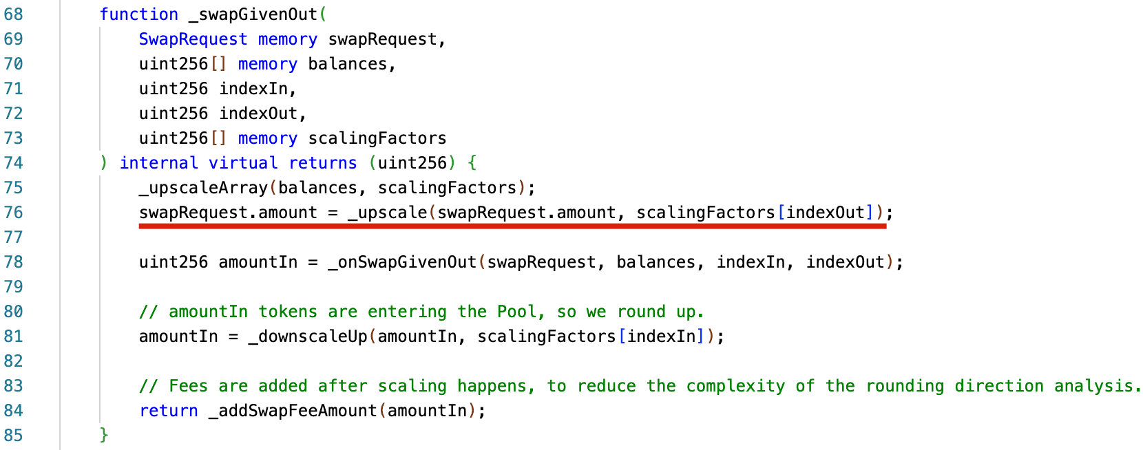The underlying issue arises from the rounding-down operation performed during upscaling in the BaseGeneralPool._swapGivenOut() function. In particular, _swapGivenOut() incorrectly rounds down swapRequest.amount through the _upscale() function. The resulting rounded value is subsequently used as amountOut when calculating amountIn via _onSwapGivenOut(). This behavior contradicts the standard practice that rounding should be applied in a manner that benefits the protocol.