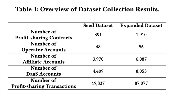 To quantify this shadow economy, the researchers developed an innovative "snowball sampling" approach. Starting from a seed set of known phishing addresses, they traced on-chain profit-sharing transactions to recursively discover new operators, affiliates, and contracts.