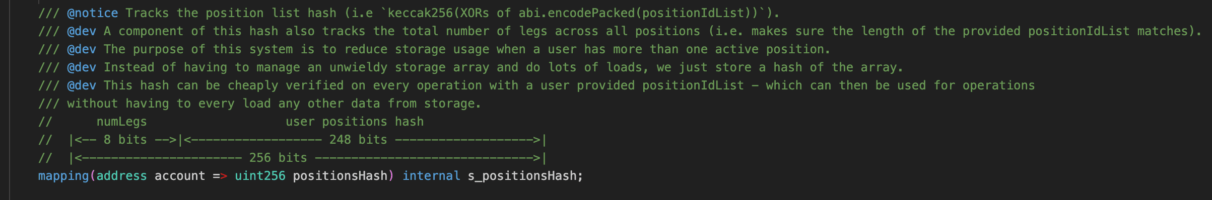 To save gas, the protocol does not store every position (i.e., tokenId) of the user. Instead, it calculates a fingerprint based on all the user's tokenIds and records it in s_positionsHash. The most significant 8 bits of each s_positionsHash represent numLegs, while the lower 248 bits represent the user position hash.