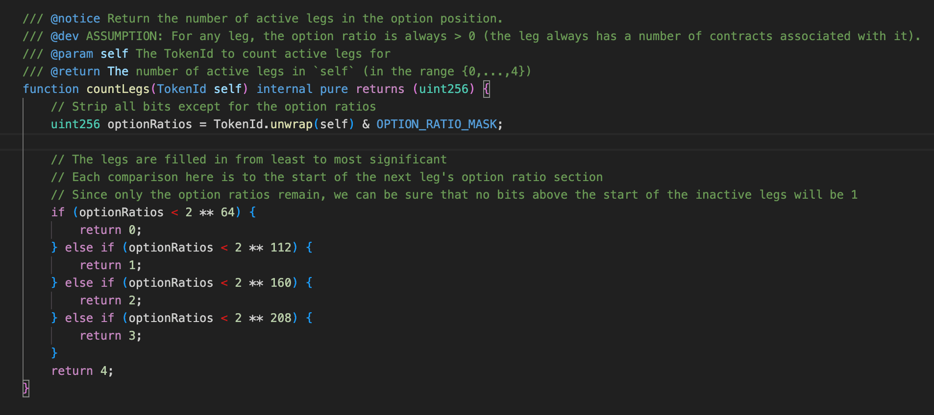 Simultaneously, countLegs is adjusted based on the numerical range of the tokenId: it remains unchanged when tokenId is below , and increases by 1, 2, or 3 when in the ranges , , and respectively. This is finally written to the top 8 bits of s_positionsHash to update numLegs.