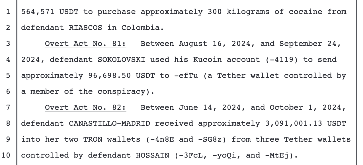 Overt Act No.8l: Between August16, 2024, and September 24, 2024, defendant SOKOLOVSKI used his Kucoin account (-4119) to send approximately 96,698.50 UsDT to -efTu (a Tether wallet controlled by a member of the conspiracy).