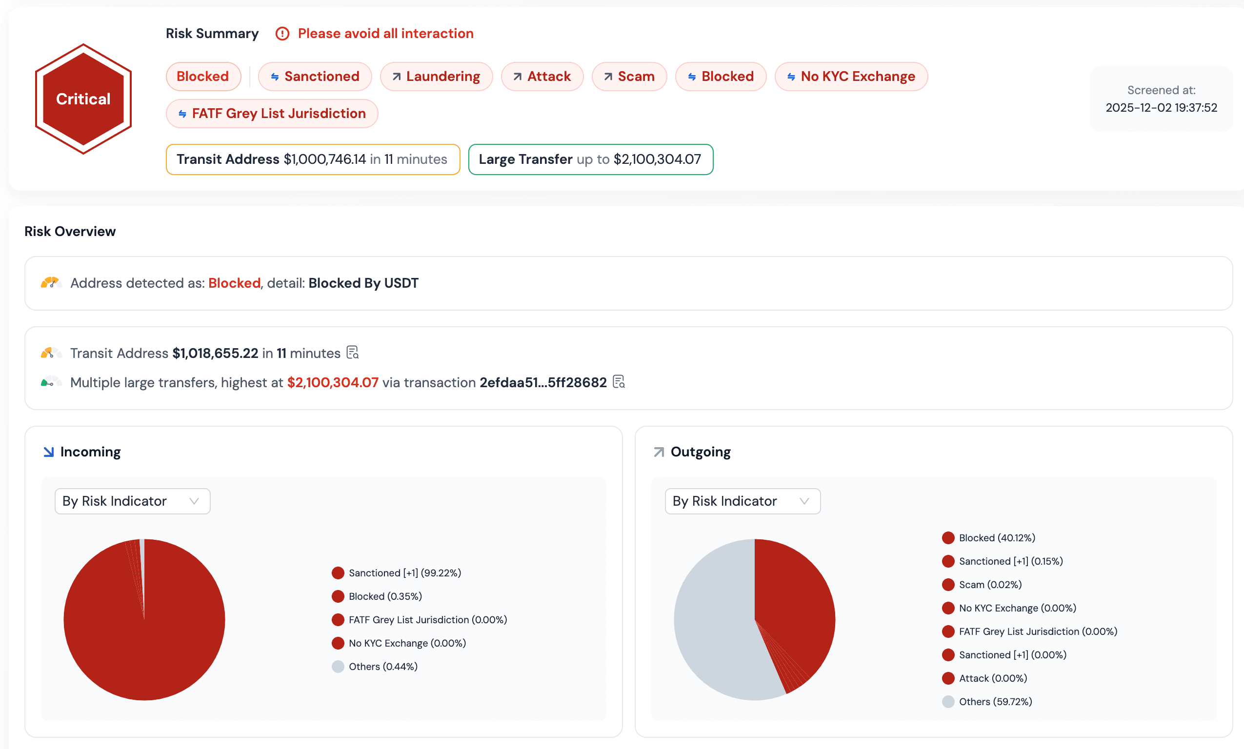 Both the source and the destination of the funds are heavily tied to high-risk groups. This confirms that this address plays a key role in the money laundering chain of the Wedding criminal group.