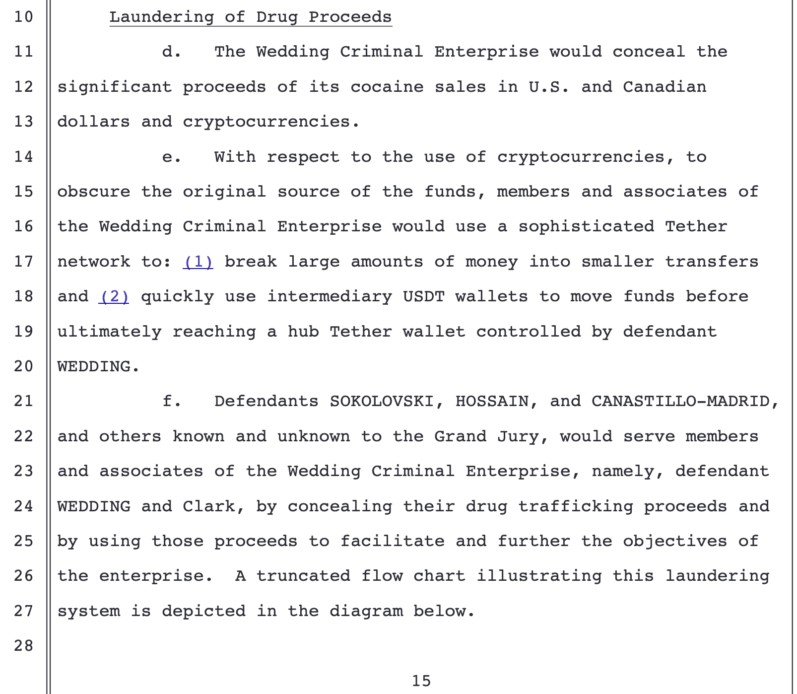 The indictment states that the Wedding criminal group launders drug profits. They use U.S. dollars, Canadian dollars, and cryptocurrency for this. For their crypto assets, they use a specific method to hide the trail. They break large amounts of money into many small transfers. These funds move quickly through intermediate USDT wallets. Finally, all the money arrives in a central Tether wallet that Wedding controls directly.