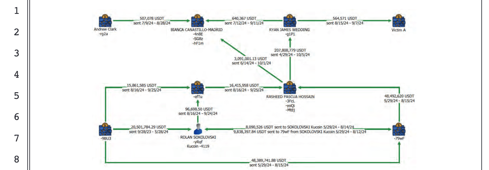 Overt Act No.75: Between June 14, 2024, and October 1, 2024, defendant HOSSAIN used his Tether wallets (-yoQi and -MtEj) to send approximately 3,091,001.13 USDT to one of defendant CANASTILLO-MADRID's TRON wallets (-4n8E).