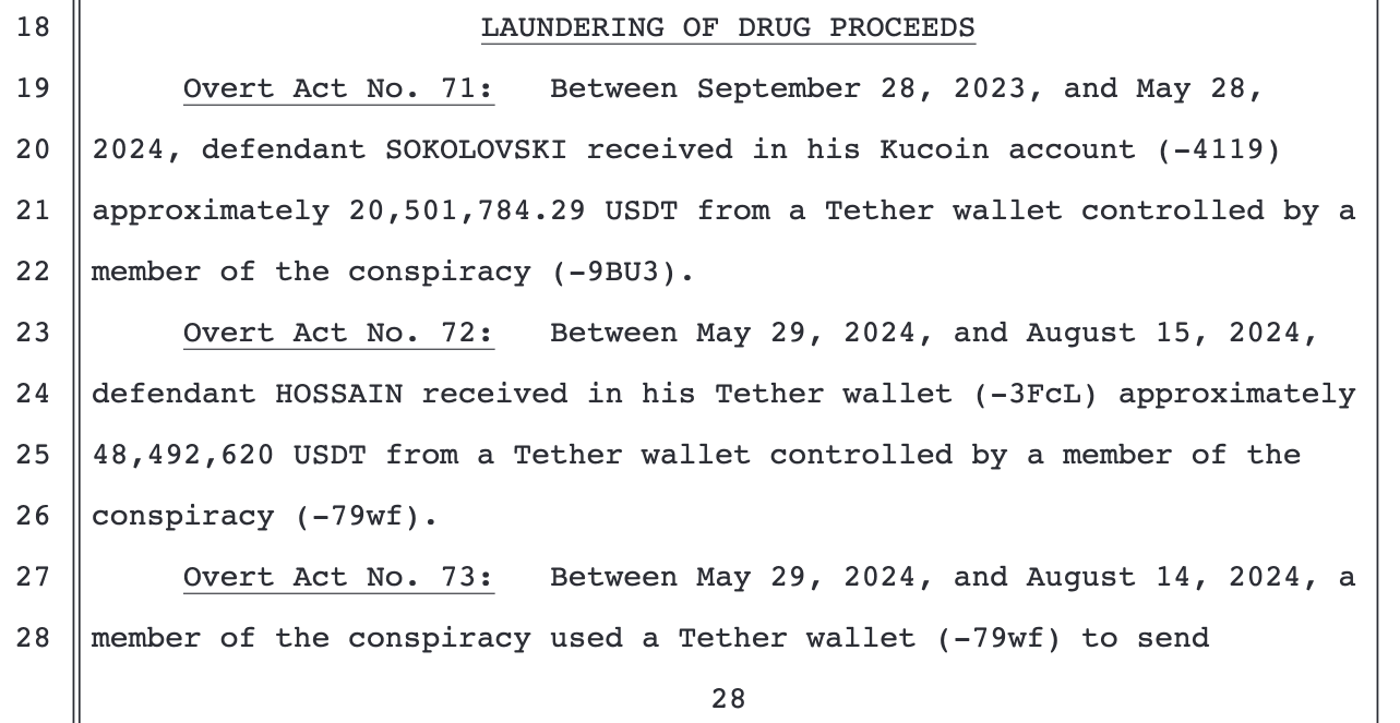 Overt Act No.71: Between September 28, 2023,and May 28, 2024, defendant SOKOLOVSKI received in his Kucoin account (-4119) approximately 20,501,784.29 USDT from a Tether wallet controlled by a member of the conspiracy (-9BU3).