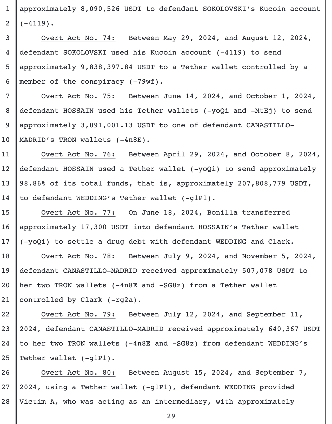 Overt Act No. 74: Between May29, 2024, and August12, 2024 defendant SOKOLOVSKI used his Kucoin account (-4119) to send approximately 9,838,397.84 USDT to a Tether wallet controlled by a member of the conspiracy (-79wf).