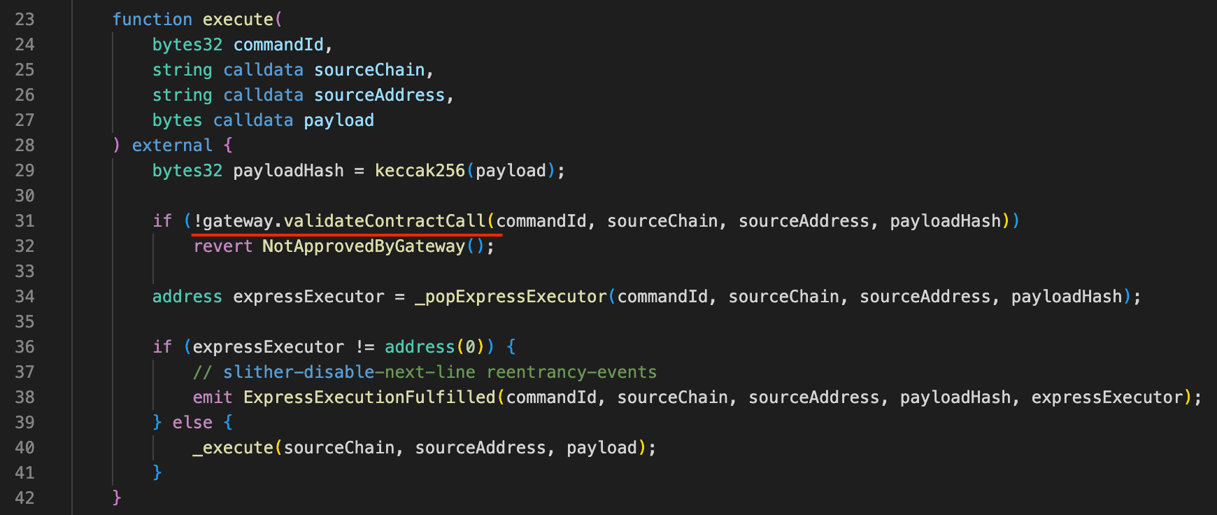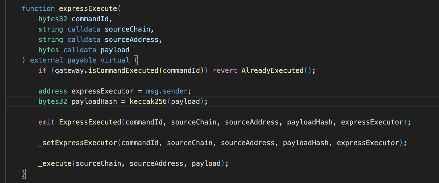 To reduce latency, Axelar also provides an express execution mechanism, where a receiver contract may optimistically execute a message before the Gateway finalizes validation. This design requires strict access control to ensure that only trusted executors can invoke express execution paths; otherwise, unvalidated cross-chain messages may be processed prematurely.