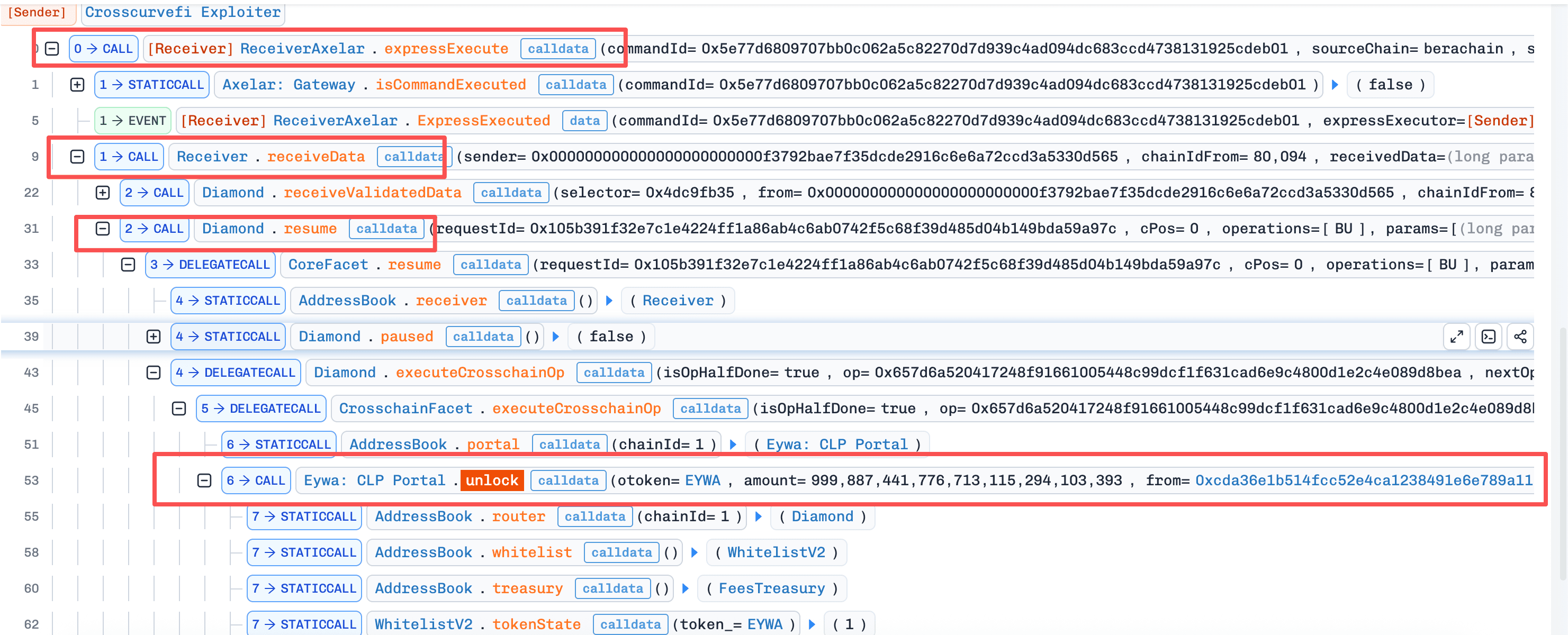 However, the expressExecute() path skipped this validation entirely. It relied only on a peer check using sourceChain and sourceAddress, both of which were attacker-controlled, and therefore provided no real security. This allowed the attacker to supply a spoofed message, force the receiveData branch, and execute an arbitrary payload that ultimately triggered unlock() on the Eywa CLP Portal, resulting in the unauthorized release of cross-chain assets.