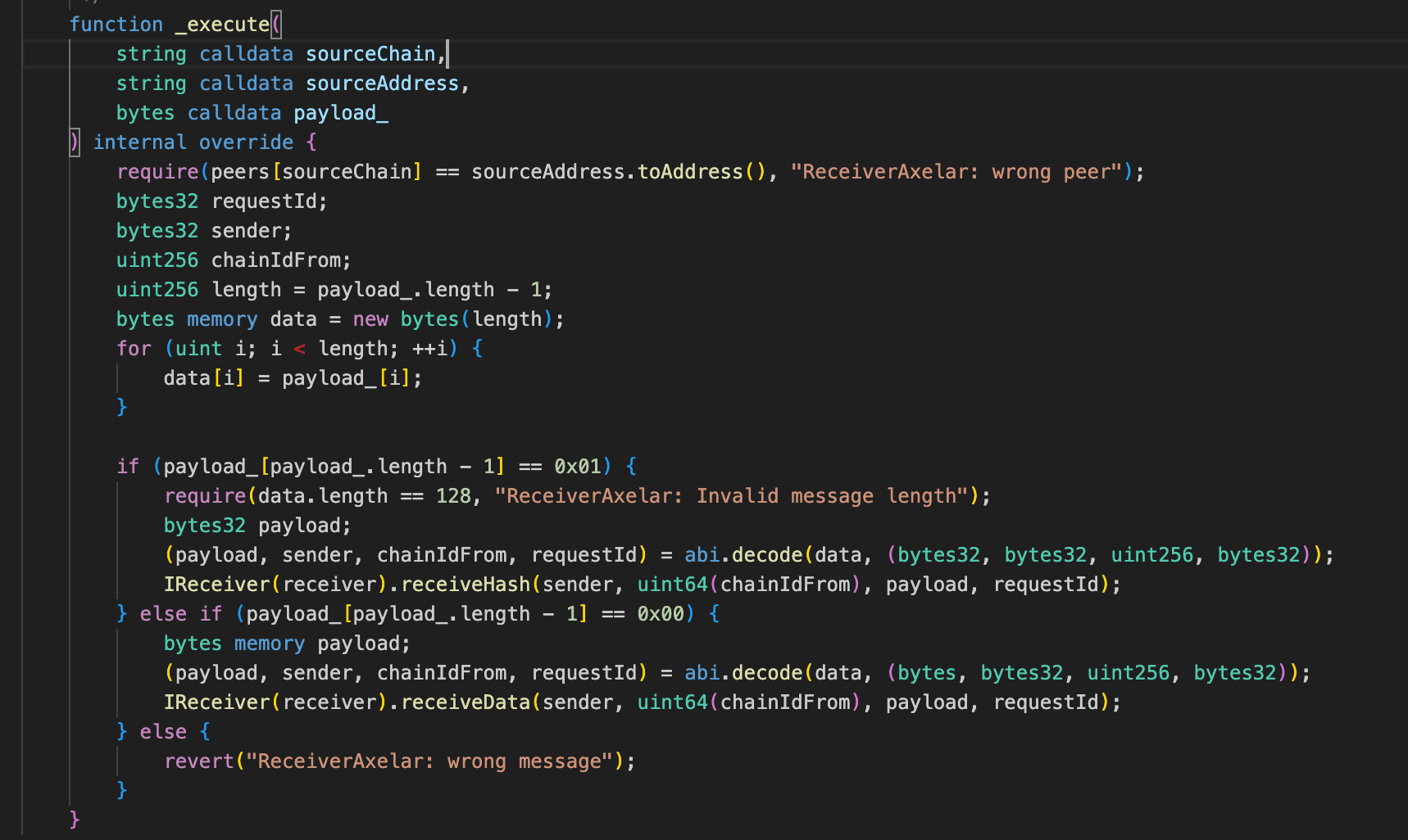 expressExecute(), spoofing thesourceChain,sourceAddress, andpayload. SinceexpressExecute()bypasses Gateway validation and proceeds directly to_execute(), the only remaining security measure was a peer-address whitelist check:require(peers[sourceChain] == sourceAddress.toAddress()). This check was insufficient because bothsourceChainandsourceAddresswere externally supplied. By providing the correct whitelisted peer address, the attacker bypassed it. -