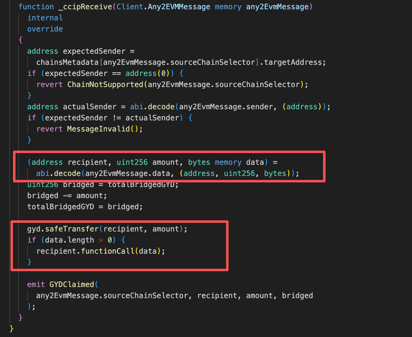 _ccipReceive()function of theGydL1CCipEscrowcontract executed the approval on the GYD token contract without validatingtx.recipient. The attacker then calledtransferFrom()on the GYD token to drain all escrowed funds.