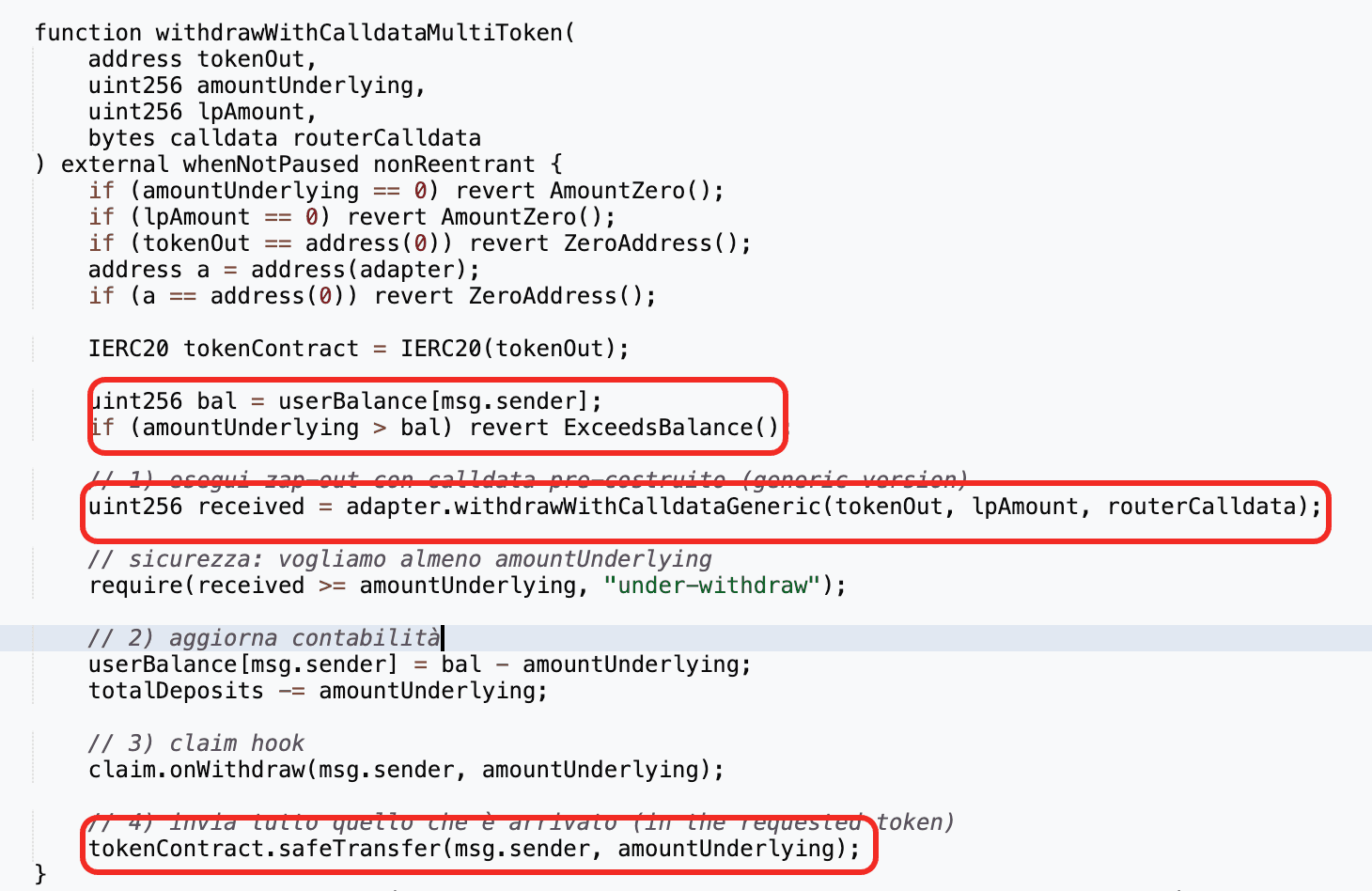 The root cause is unvalidated input data. The function withdrawWithCalldataMultiToken() takes four parameters: the underlying token, the underlying amount, the LP amount, and routerCalldata. It only checks whether the user's recorded underlying balance is sufficient, but does not validate the LP amount or the contents of routerCalldata. When removing liquidity via the Pendle Router, the contract relies entirely on parameters embedded in routerCalldata. As a result, an attacker could pass the protocol's full LP balance and set themselves as the receiver, draining all assets held by the protocol.