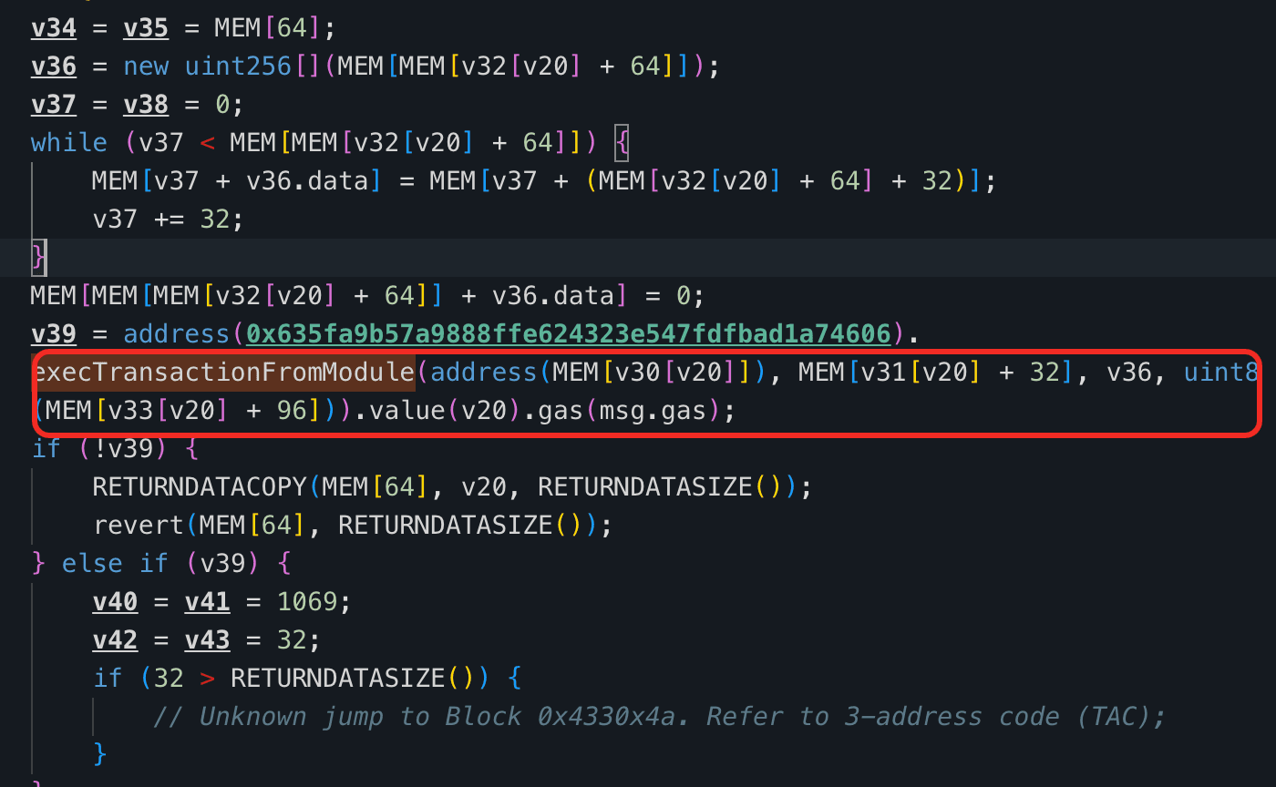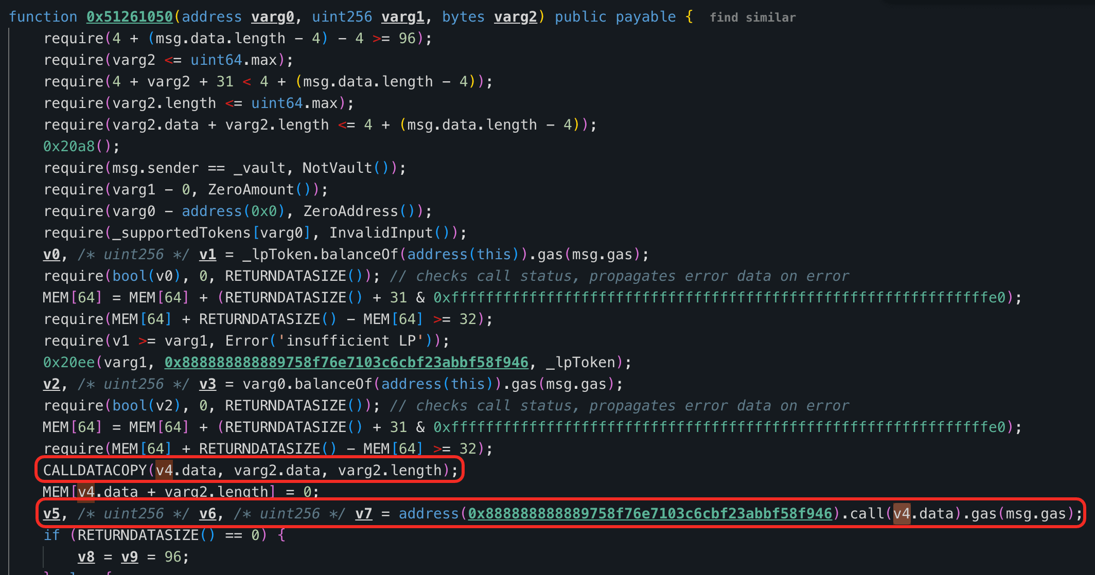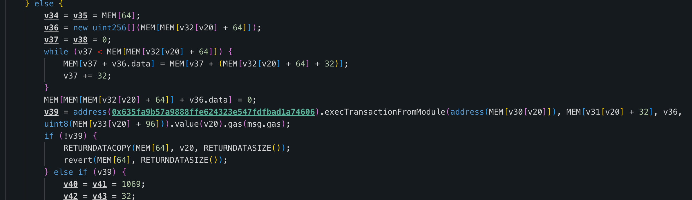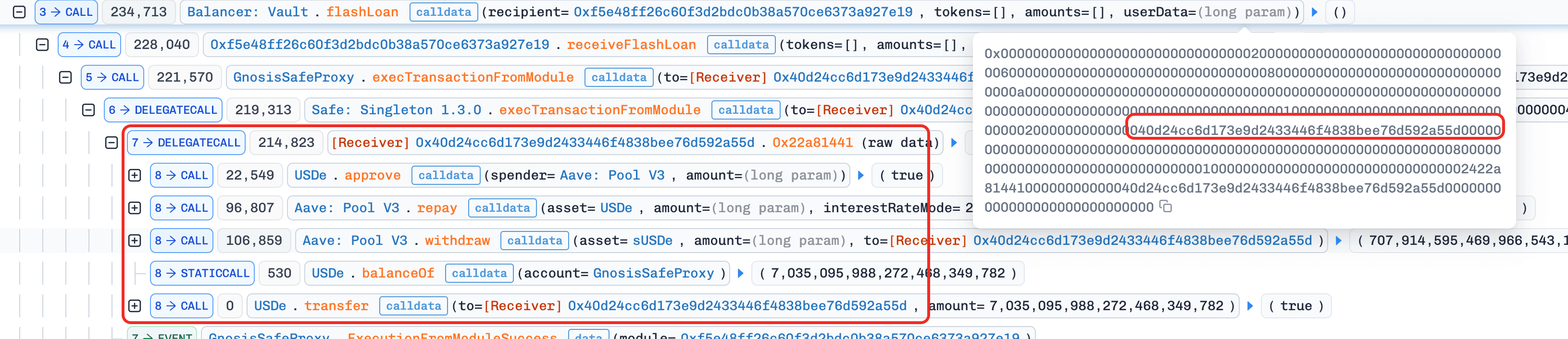 0xF5E4.receiveFlashLoan(), the contract decoded the attacker-supplieduserData. Since0xF5E4is registered as a Safe module, it bypassed signature checks and invokedexecTransactionFromModule()to execute arbitrary calls as dictated by the parameters embedded inuserData. -