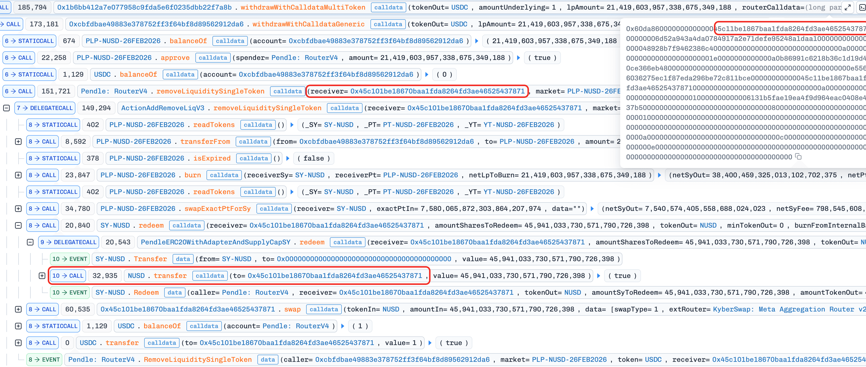 USDCinto the protocol, which routes funds through thePendle Routerto add liquidity and mint LP. -