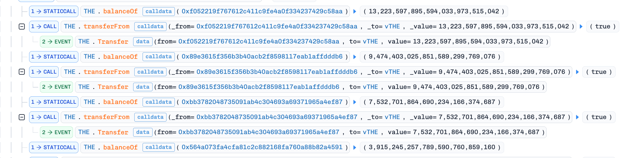 THEdirectly intovTHEmarket contract. The attack contract also borrowed 1.58MUSDC, re-supplied it, then borrowed about 4.6MTHEand transferred it directly intovTHE. This lifted theexchangeRateby about 3.81x.