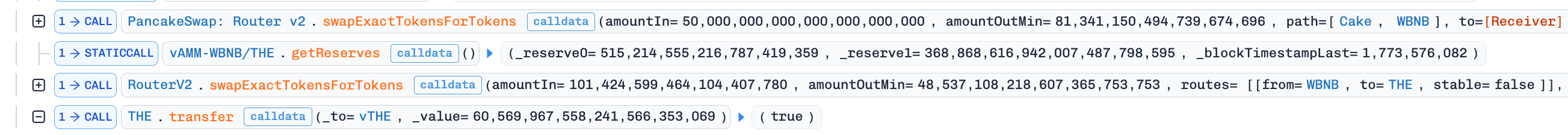 CAKE,BNB,BTCB, andUSDC. The attacker kept buyingTHEwith borrowed assets and donating moreTHEintovTHE, creating a loop that increased both position borrowing power andTHEtoken's market price.
