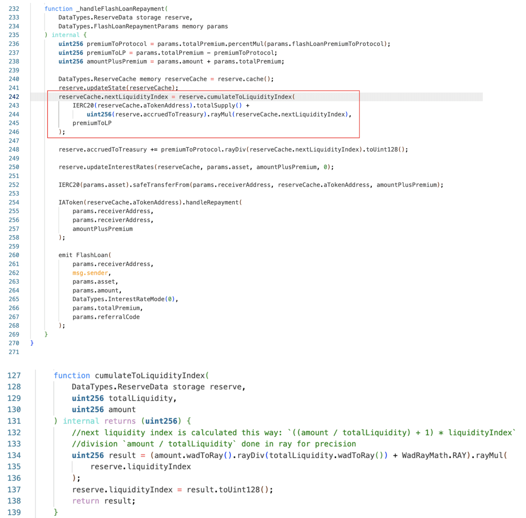 Flash loan premiums are added to reserve accounting through cumulateToLiquidityIndex(), where: