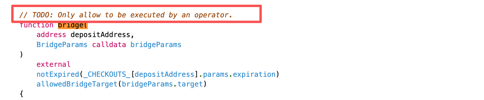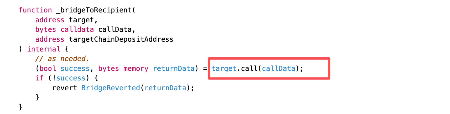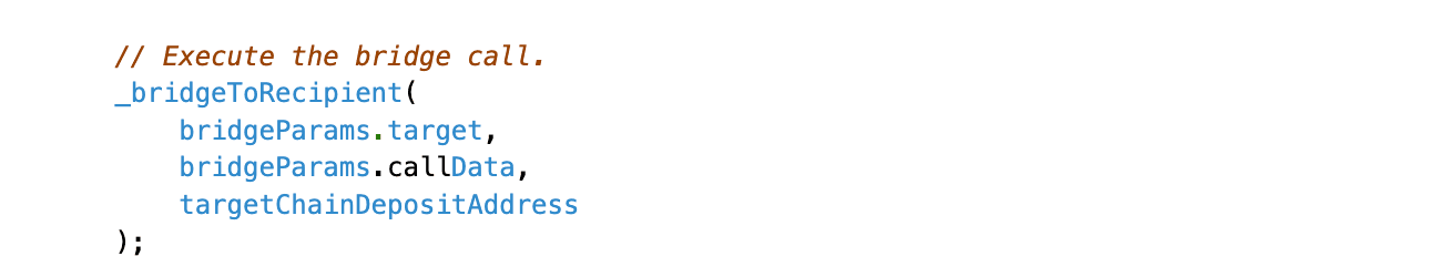 bridge()passed caller-suppliedbridgeParamsinto_bridgeToRecipient(), which performed an external call without validating the recipient against the checkout record.
