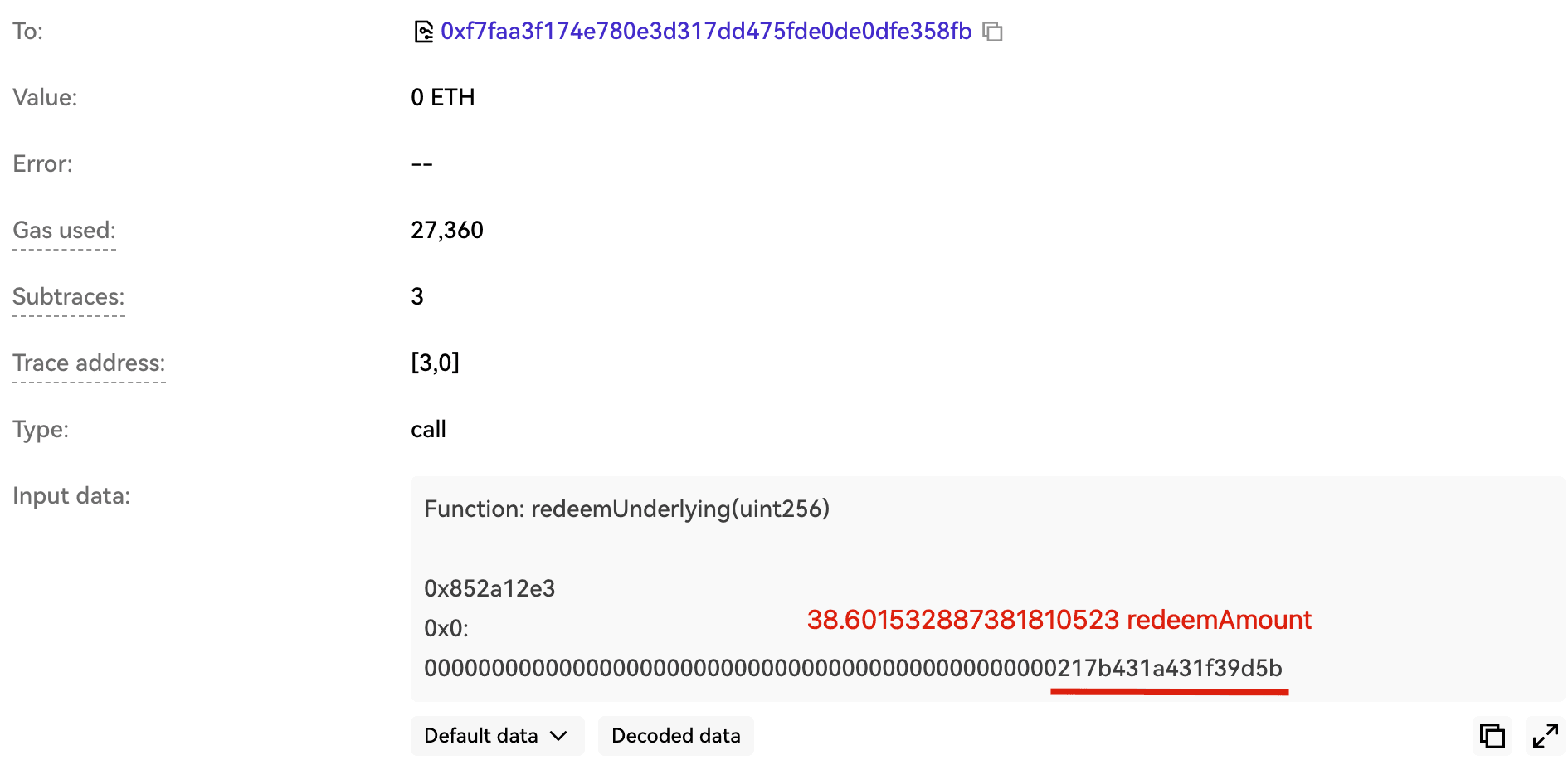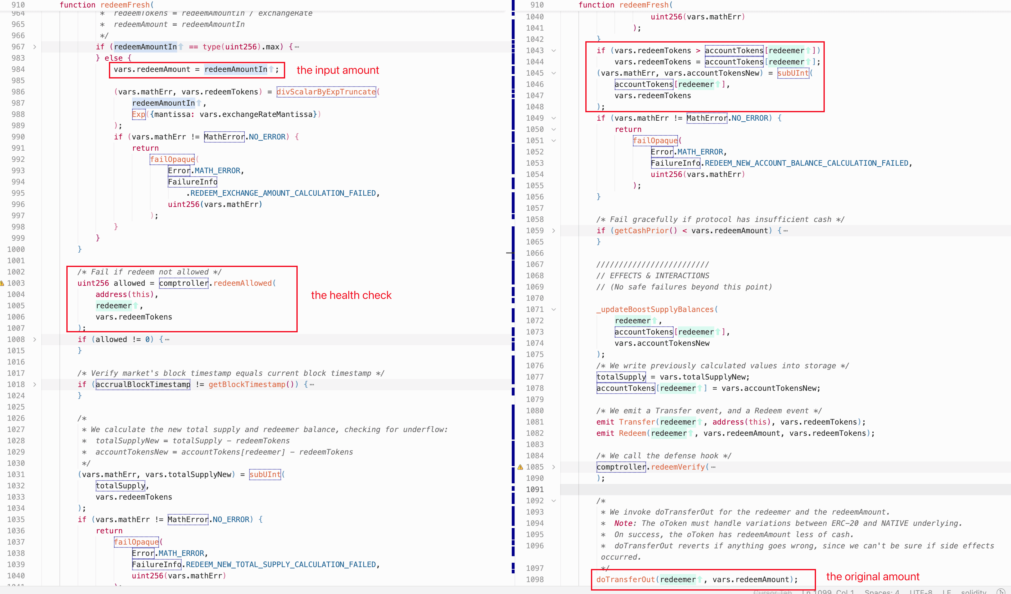 The flaw is in redeemFresh() of the kETH market (0x4c6e...0403), called by redeemUnderlying(). The user-controlled redeemAmountIn is first assigned to redeemAmount, and then used to compute redeemTokens via the current exchange rate. If redeemTokens exceeds the redeemer's balance, the function caps it to accountTokens[redeemer]. However, redeemAmount is not recomputed after this cap and remains equal to the original redeemAmountIn. This allows the redeemer to withdraw the full redeemAmount of underlying assets while only burning a fraction of the corresponding shares.
