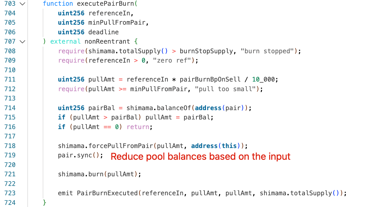 ShiMama Protocol includes an on-chain deflation mechanism intended to pull tokens from the AMM pair and burn them. This mechanism is implemented across ShiMama Protocol and ShiMama Token. The function executePairBurn() in ShiMama Protocol computes a pull amount from a caller-supplied referenceIn parameter: