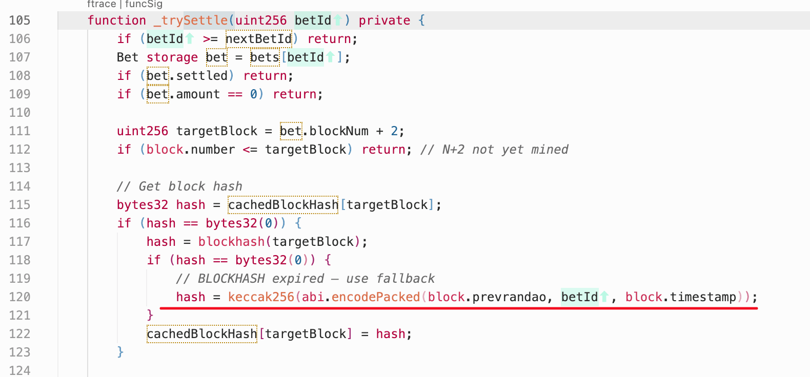 blockhashreturned zero and the fallback path activated. The attacker then simulated outcomes off-chain and calledsettle()only at a block where the computed result was favorable (e.g., 0x68eedc...718ce8).