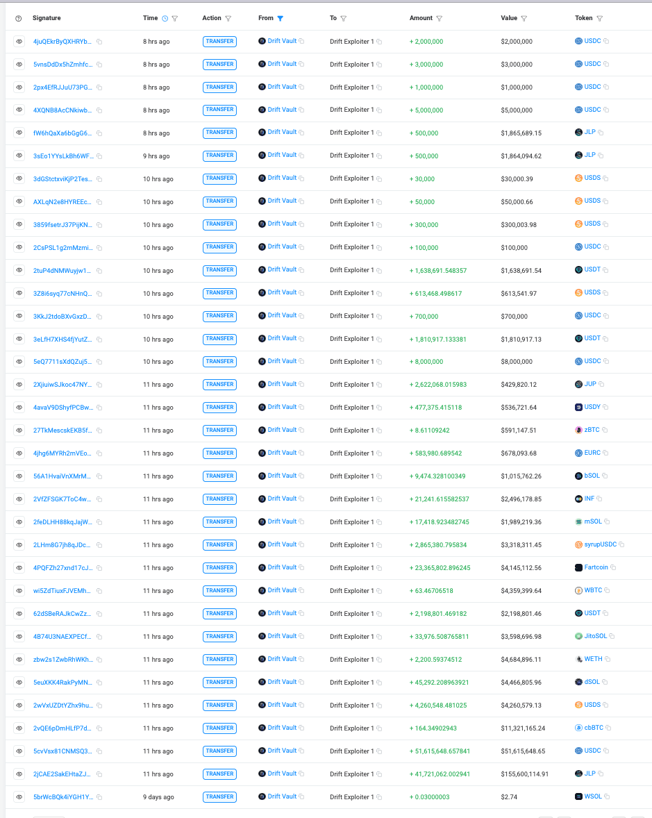 CVT, switched to an attacker-controlled oracle to inflate its book price, and raised or removed withdrawal limits on major asset markets. The attacker then deposited a large amount of overvaluedCVTinto the protocol and executed 31 rapid withdrawals over approximately 12 minutes, drainingUSDC,JLP,SOL,cbBTC,USDT,wETH,dSOL,WBTC,JTO, andFARTCOINfor a total loss of approximately $285.3M, calculated based on the attacker's withdrawal account (HkGz4K...pZES).
