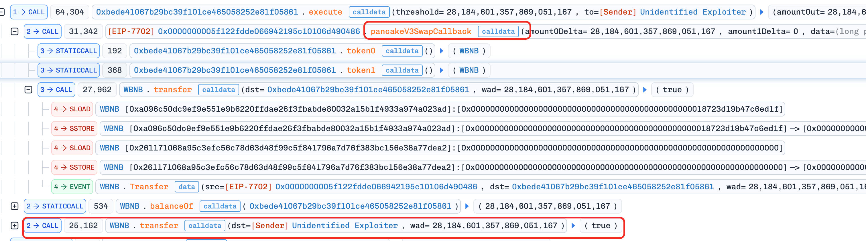 pancakeV3SwapCallback()with crafted parameters, triggering the callback transfer logic to move the victim's tokens out to attacker-controlled addresses.
