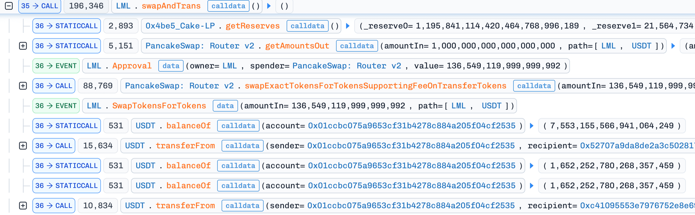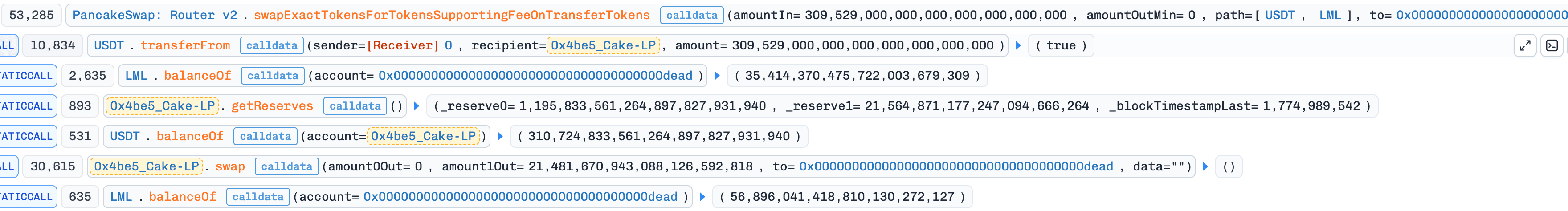 USDTforLMLvia PancakeRouterswapExactTokensForTokensSupportingFeeOnTransferTokens, with the recipient set to the dead address. The purchasedLMLtokens were burned rather than received by the attacker. The sole purpose was to drainLMLfrom the pair and inflate theLMLprice on the AMM, the attacker did not need the tokens themselves, only the price distortion.
