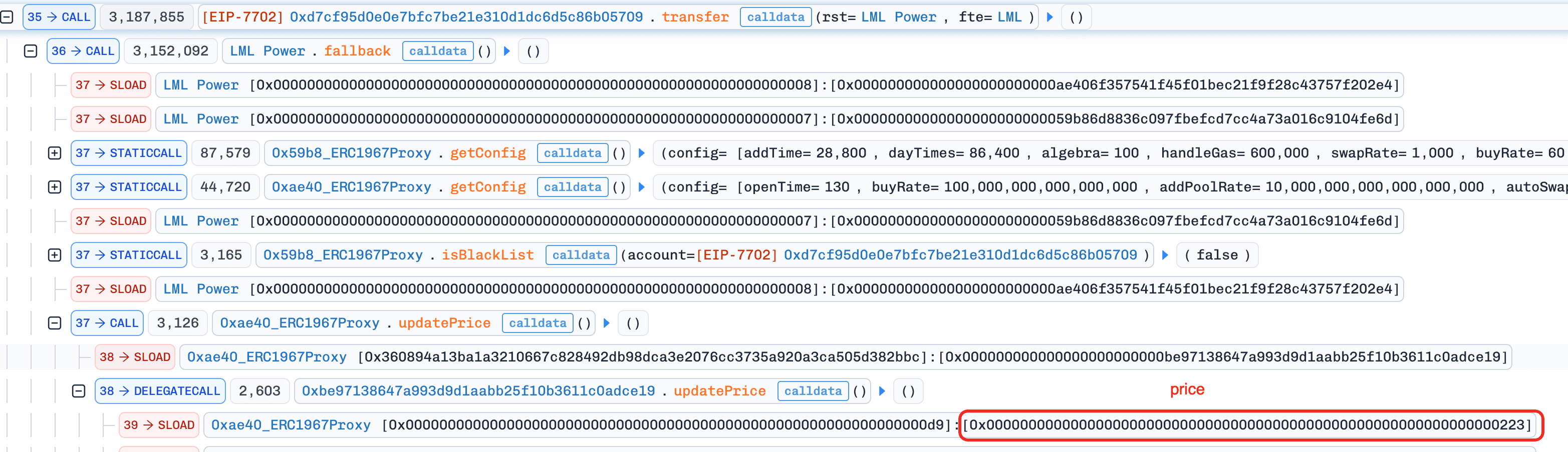 receive()triggers_claimReward(msg.sender)based onmsg.sender, rewards can only be claimed by the depositing address itself. To claim rewards for all 11 EOAs within a single transaction, the attacker used EIP-7702 to set code on these EOAs, enabling them to be called as contracts by the attacker's main contract. Each EOA executed atransfer(rst, fte)function that sent a small amount ofBNBto APower, triggeringreceive(),_claimReward(EOA). Inside each claim:updatePrice()was skipped (3600s cooldown not met, sostored_priceremained at the historical low value),updateUser()calculated the reward using the stale low price,sendMining()transferredLMLfrom PROOF to APower and then triggeredswapBack()which replenished PROOF by pullingLMLfrom the LP pair and callingsync(), further reducing the pair's reserves. FinallyclaimReward()distributedLMLto the EOA, and each EOA transferred its receivedLMLback to the attacker contract.