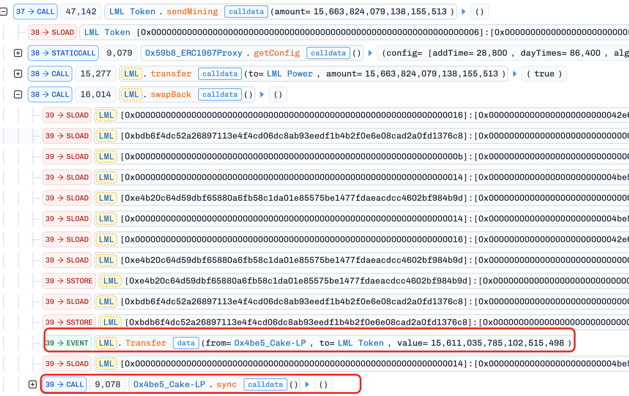 swapAndTrans()on theLMLtoken contract, which swapped theLMLfees accumulated in the contract toUSDT. This drained theLMLcontract's ownLMLbalance, meaning it could no longer serve as a local token source, any subsequent reward distribution would need to pullLMLfrom the LP pair viaswapBack().