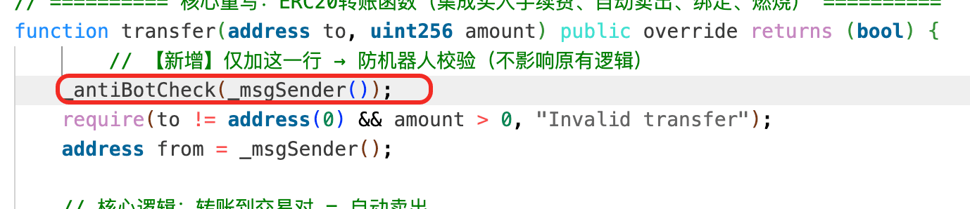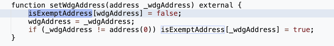 setWdgAddress()to set their own address as fee-exempt, allowing subsequent transfers to bypass the token's transfer fee.