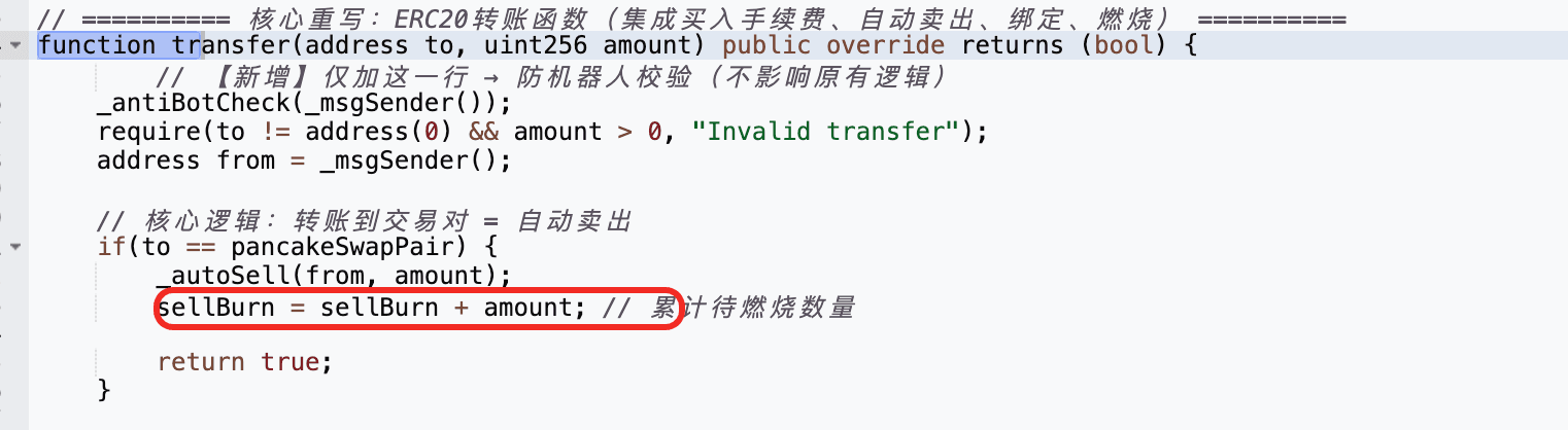 The core flaw in the SAS token contract (0xbfa266...3d91c6) is in how the deflationary mechanism is wired into transfer(). When SAS is sent to the LP pool, the contract increments a global sellBurn accumulator by the transferred amount. Then, on any later ordinary transfer, if sellBurn is non-zero, the contract calls _burnFromPair() to burn SAS directly from the LP pool and follows it with sync(), which rewrites the pool's reserves to match its on-chain balance.