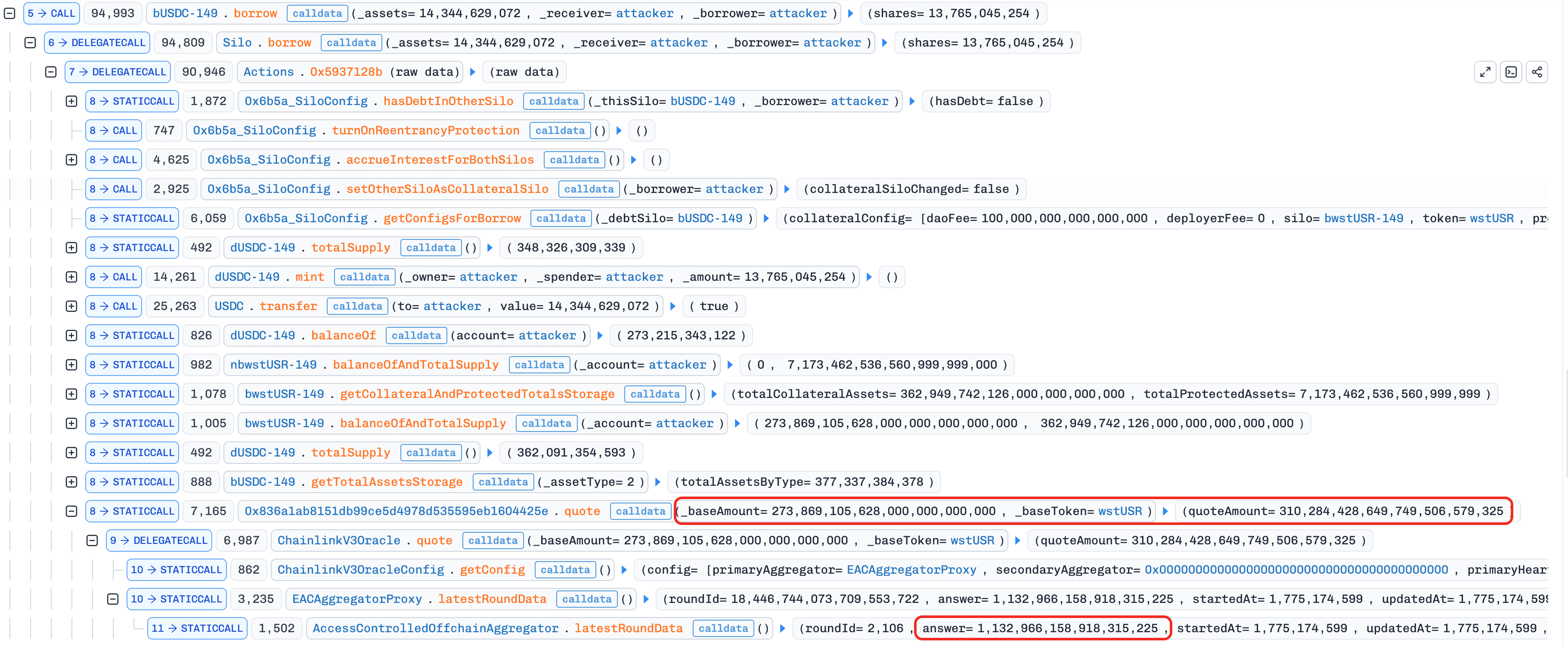 wstUSR (Wrapped Staked USR) is a staking derivative of the USR stablecoin issued by Resolv. After Resolv was exploited, USR depegged, stUSR lost its peg as well, and wstUSR's secondary market price collapsed to ~0.12. However, the Chainlink feed for wstUSR only tracked the wstUSR/stUSR exchange rate (~1.133), and the protocol implicitly assumed 1 stUSR = 1 USD, so the oracle continued pricing wstUSR at ~1.133, a ~10x gap versus market reality.