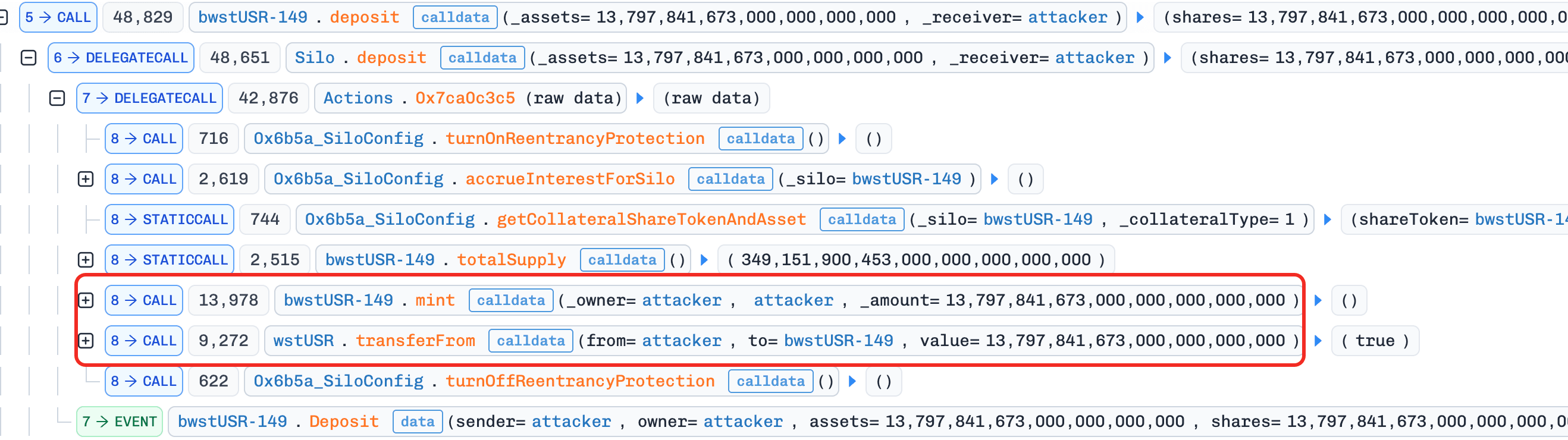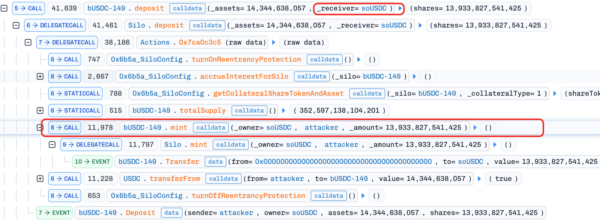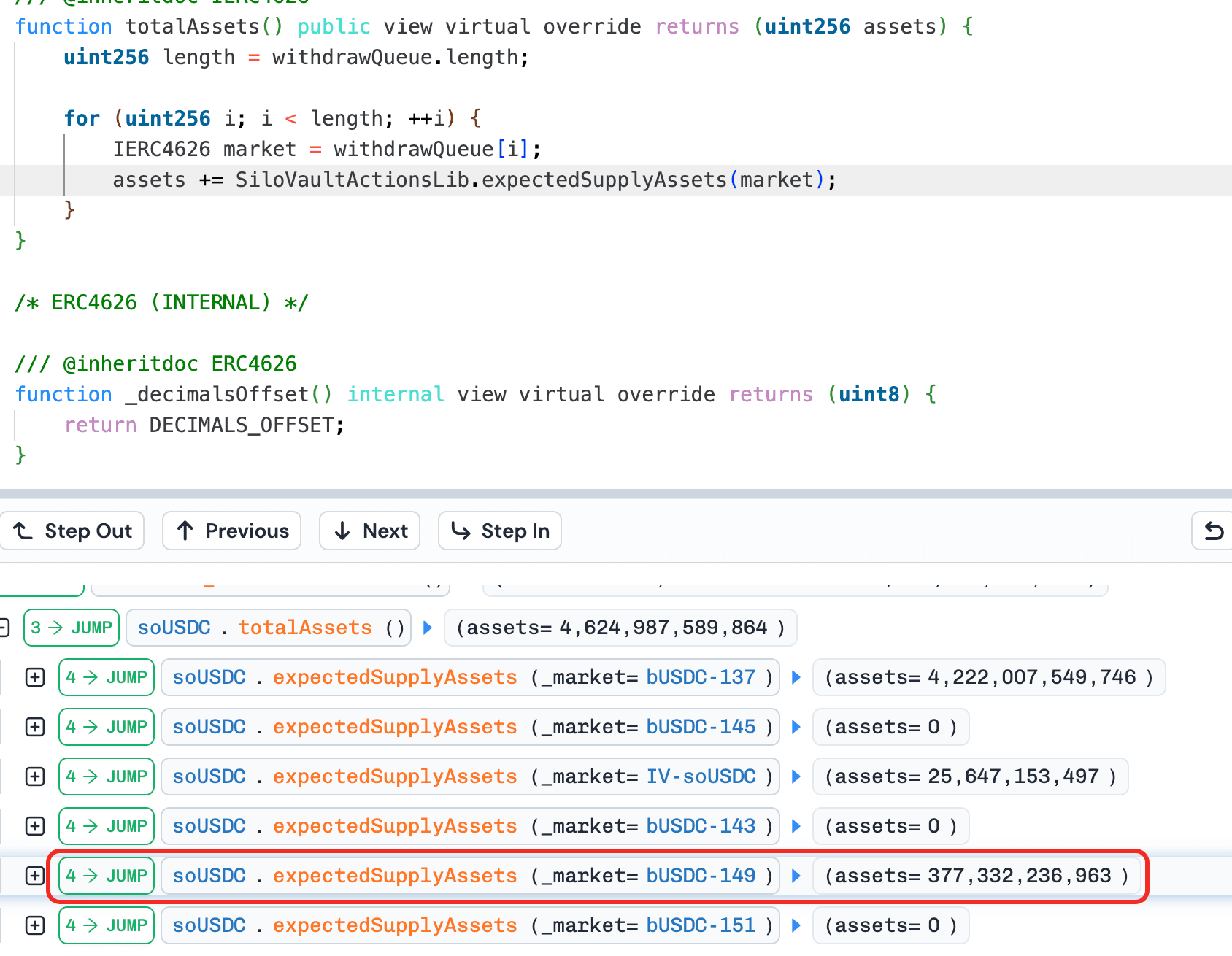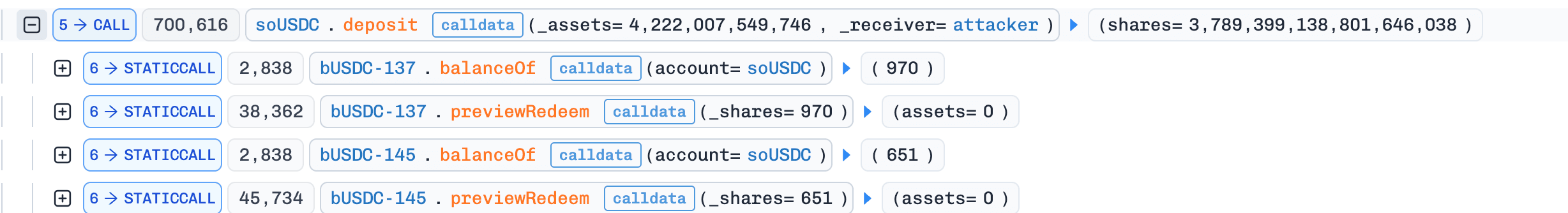 USDCdirectly into thewstUSRmarket viawstUSR_Market.deposit(receiver=soUSDC)and mintbUSDC-149tosoUSDC. The resultingbUSDCshares are credited tosoUSDC's address, not the attacker's. This is the core manipulation:soUSDC'stotalAssets()now includes thesebUSDCshares at face value (~14,344USDC), but no newsoUSDCshares are minted because the vault's own deposit logic was never invoked -totalAssetsgoes up,totalSharesstays the same, and thesoUSDCshare price inflates. At the same time, this createsUSDCliquidity in the previously emptywstUSRmarket, which is needed for the next step.